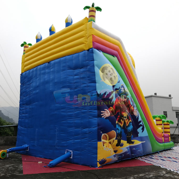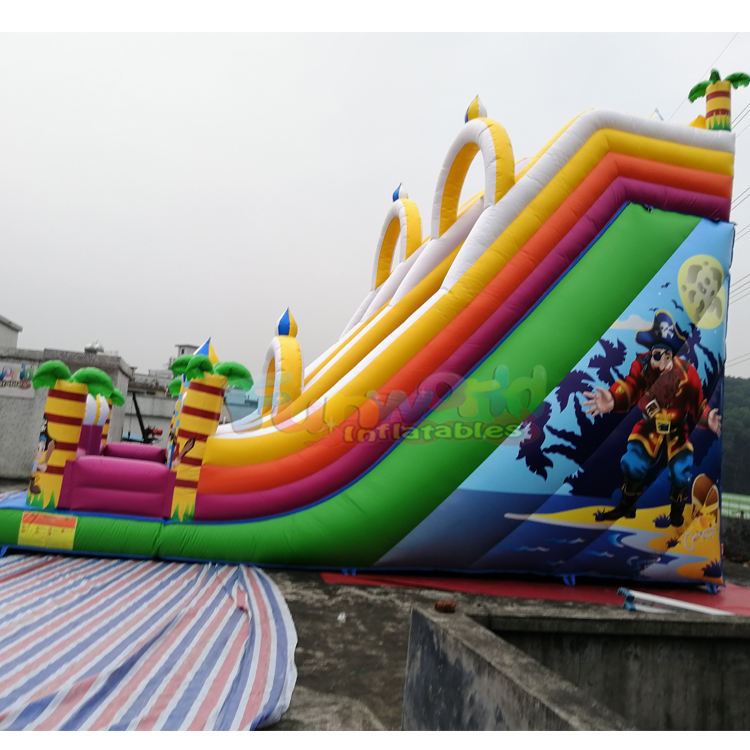 เครื่องเล่นเป่าลมแบบสองเลนสำหรับผจญภัย ชุดเครื่องเล่นเป่าลมธีมโจรสลัดพร้อมสไลเดอร์เป่าลมแบบแห้ง บ้านลมสำหรับเด็ก