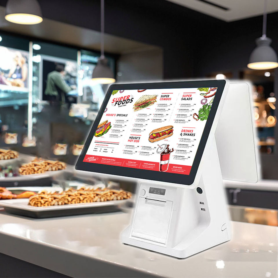 จอคู่ขนาด15.6นิ้วระบบลงทะเบียนเงินสดแบบสัมผัสเดียวสำหรับร้านเสริมสวยระบบ120W ระบบไฟฟ้า Intel I5 4G/WiFi Windows