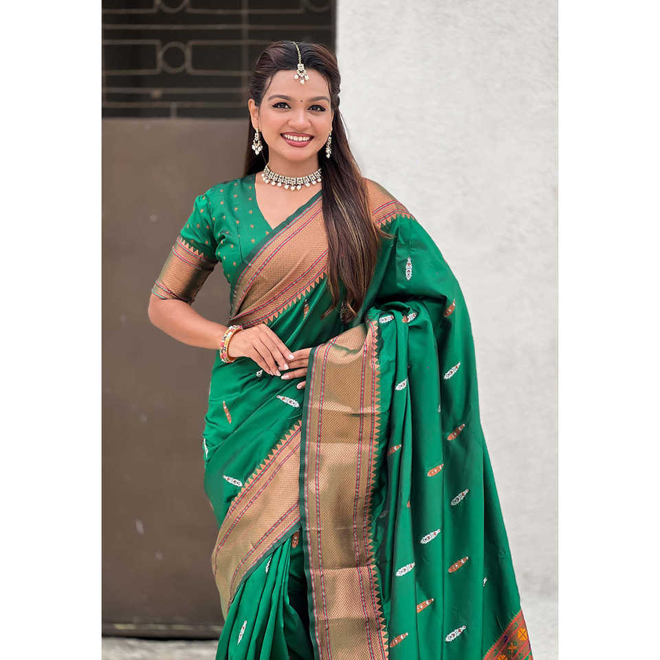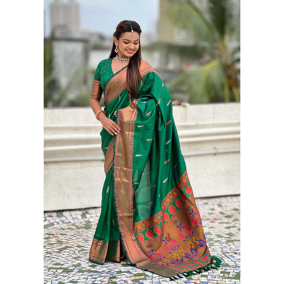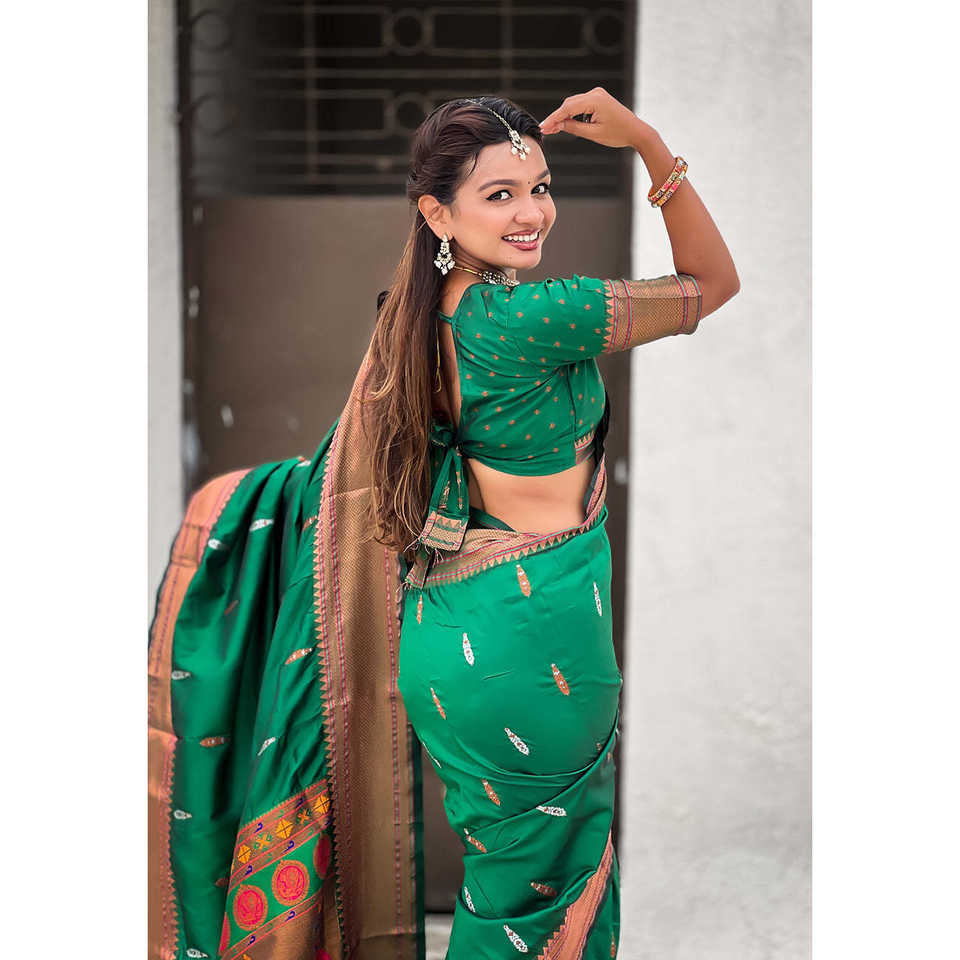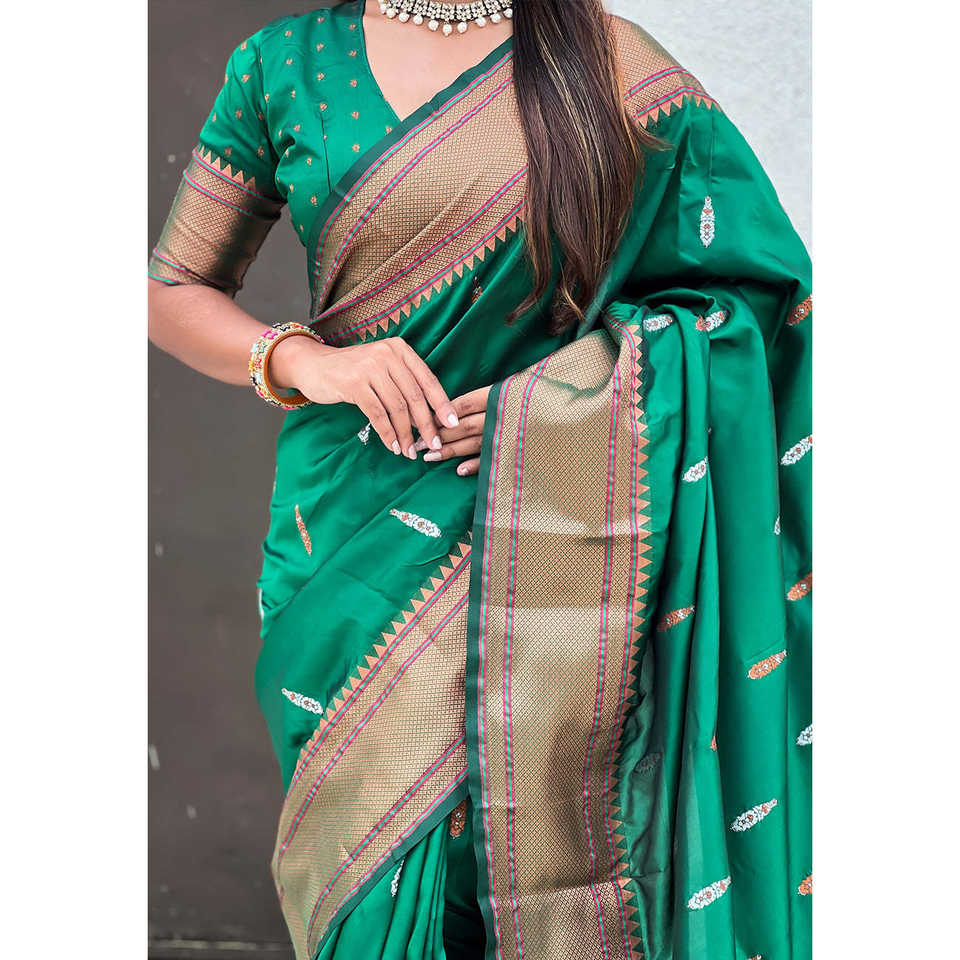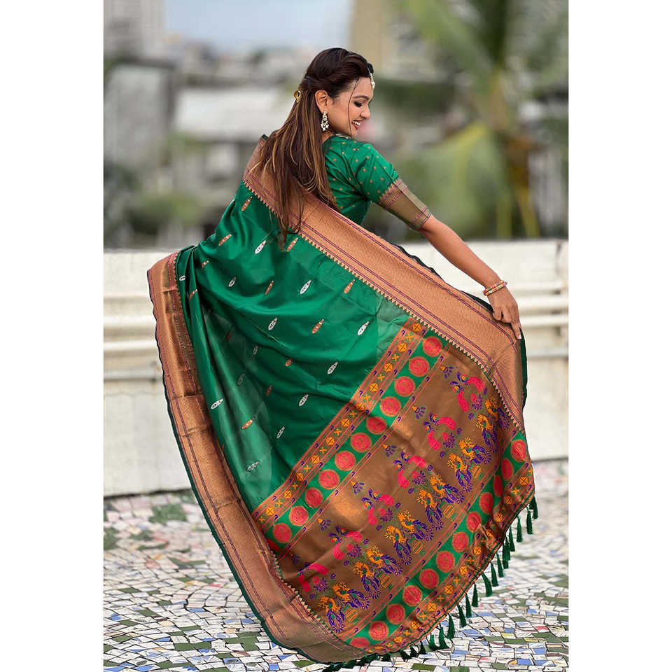 ผ้าไหมพายทานีสีเขียวเยโอล่าแบบดั้งเดิมทอแบบดูอัลซารี น้ำหนัก 650 กรัม ลายทอระดับพรีเมียม