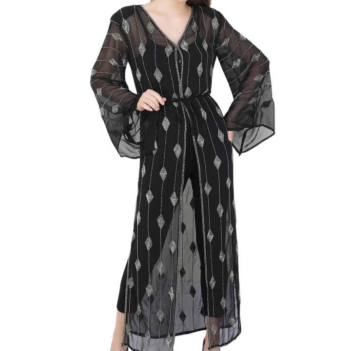 เสื้อโค้ทผ้าโปร่งสำหรับงานปาร์ตี้เปิดด้านหน้าทรงยาวทำมือดูสง่างามเหนือกาลเวลาจาก Dubai