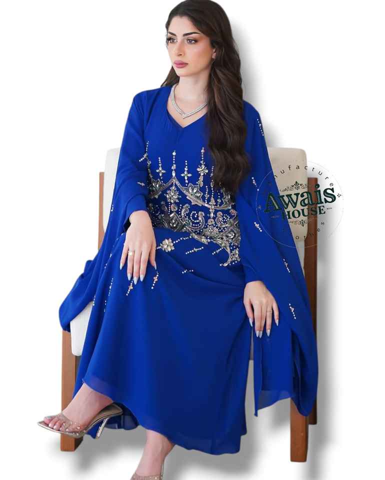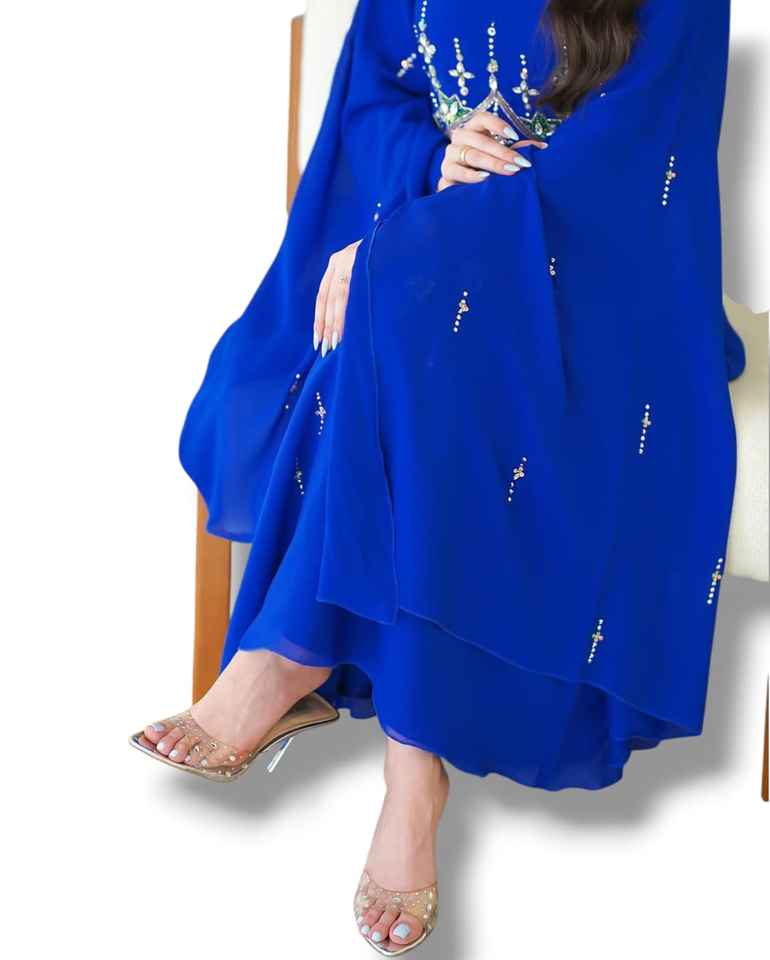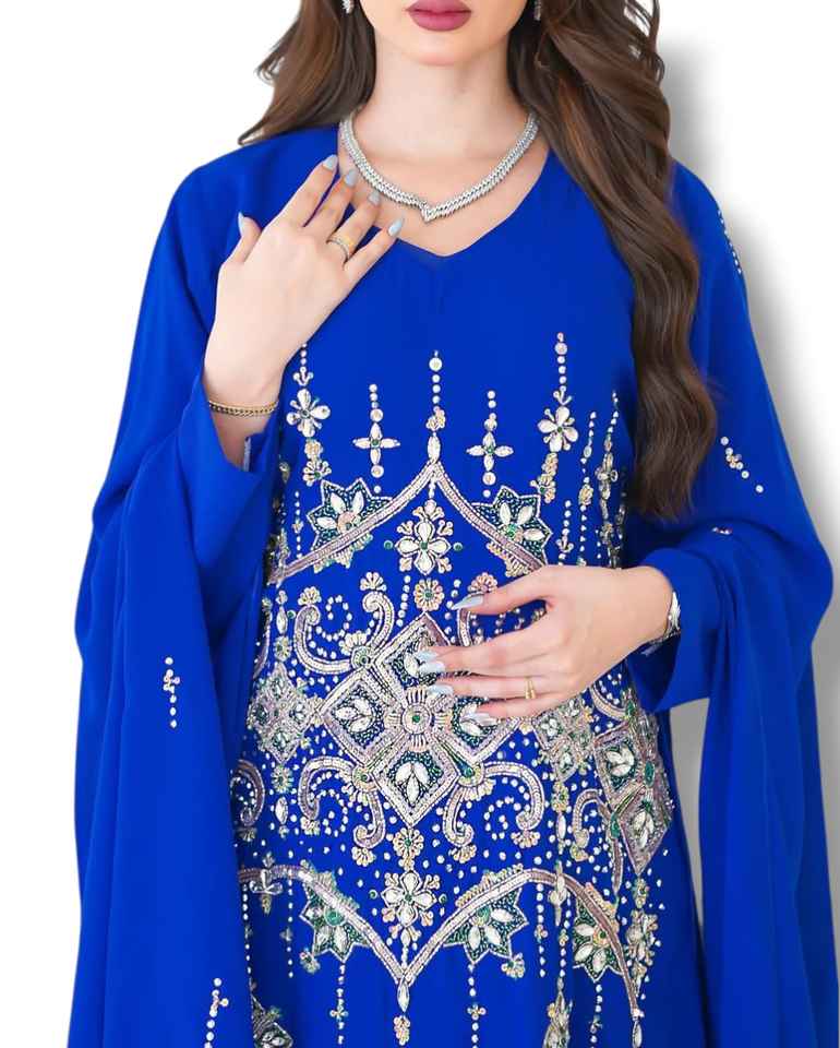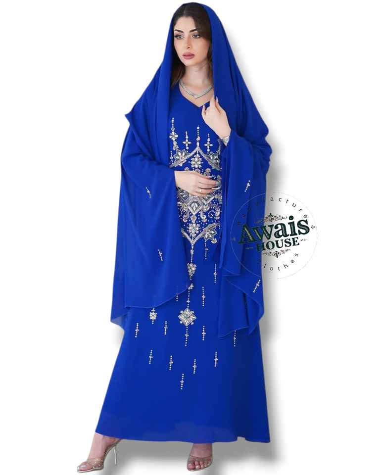 ชุดอาบายะสองชิ้นแบบดั้งเดิมของชาวมุสลิม ประดับด้วยลูกปัดและงานปักอย่างเรียบง่าย แต่หรูหรา ได้แรงบันดาลใจจากดูไบ พร้อมเครื่องประดับ