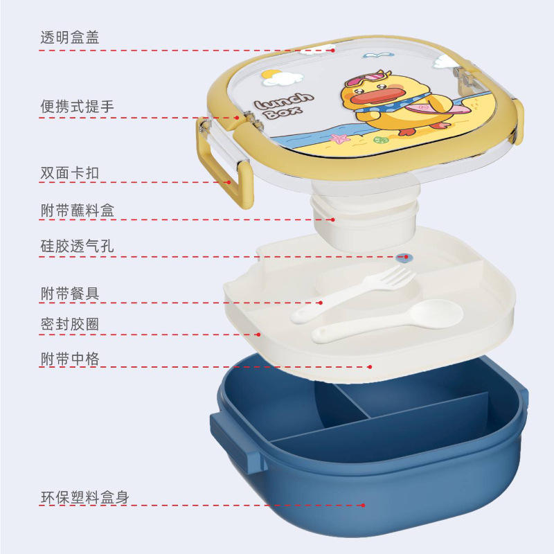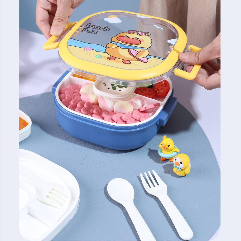 กล่องข้าวการ์ตูนรูปเป็ด 3 ช่อง ทรงสี่เหลี่ยมผืนผ้า ปิดสนิท พกพาสะดวก ใช้กับไมโครเวฟได้ สำหรับนักเรียนและพนักงานออฟฟิศ