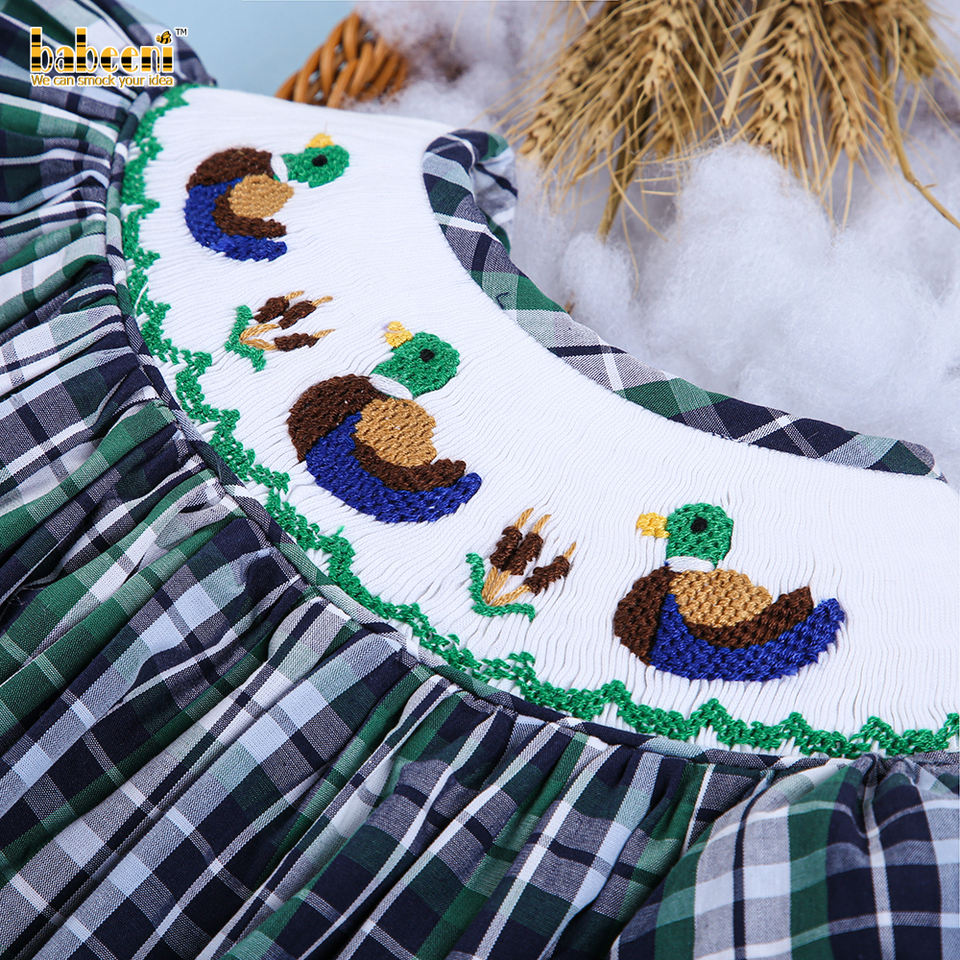 ชุดเดรสเด็กทรงเอไลน์ลายสก็อตผ้าฝ้าย 100% สำหรับฤดูหนาว รุ่น Duck Smocked Plaid รับผลิตแบบ OEM ODM ปักลายด้วยมือ ขายส่ง รหัสสินค้า BB1587