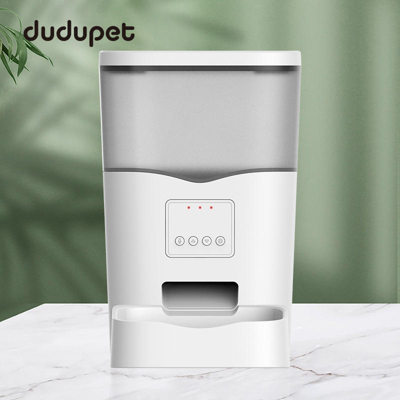 เครื่องให้อาหารสัตว์เลี้ยงอัตโนมัติ Dudupet สีขาวใส รูปทรงสี่เหลี่ยม ตั้งเวลาให้อาหารได้ สำหรับสุนัขและแมว ควบคุมผ่านแอป