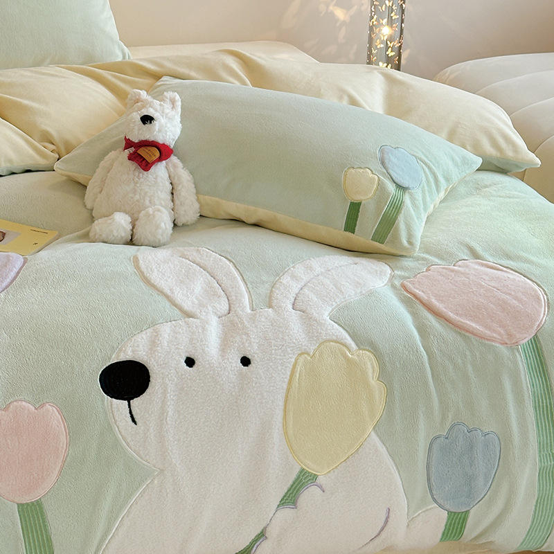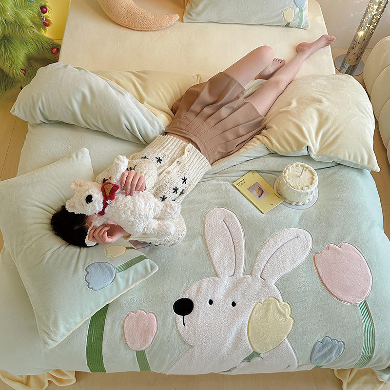 ชุดเครื่องนอนผ้าฟลีซลายนมดูโอซิเมียนคัง 4 ชิ้น ลายปักสัตว์น่ารัก ระบายอากาศได้ดี เหมาะสำหรับใช้ในบ้านและหอพัก