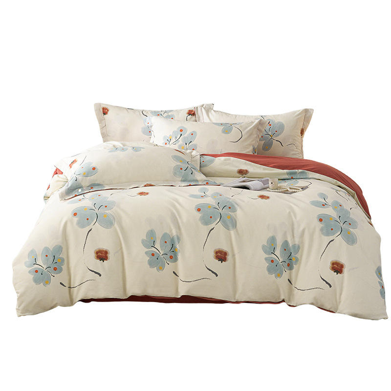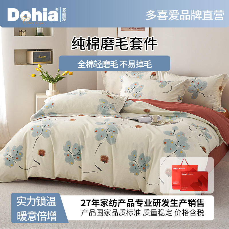 ชุดเครื่องนอนผ้าฝ้ายแท้ Duoximeimiankang แบบปัดขน 4 ชิ้น สำหรับฤดูใบไม้ร่วงและฤดูหนาว ลายดอกไม้พิมพ์ดิจิทัล ระบายอากาศได้ดี ปลอดภัยต่อผิว