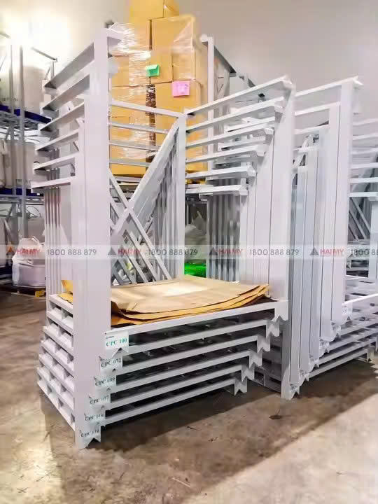 ชั้นวางโลหะแบบซ้อนได้หลายชั้น ทนทาน แข็งแรง ป้องกันการกัดกร่อน ผลิตในเวียดนาม สำหรับอุตสาหกรรม