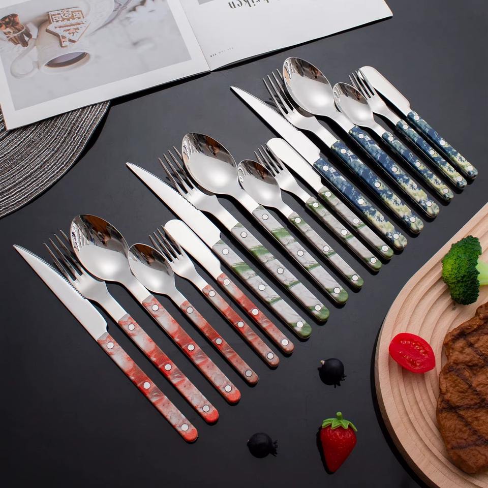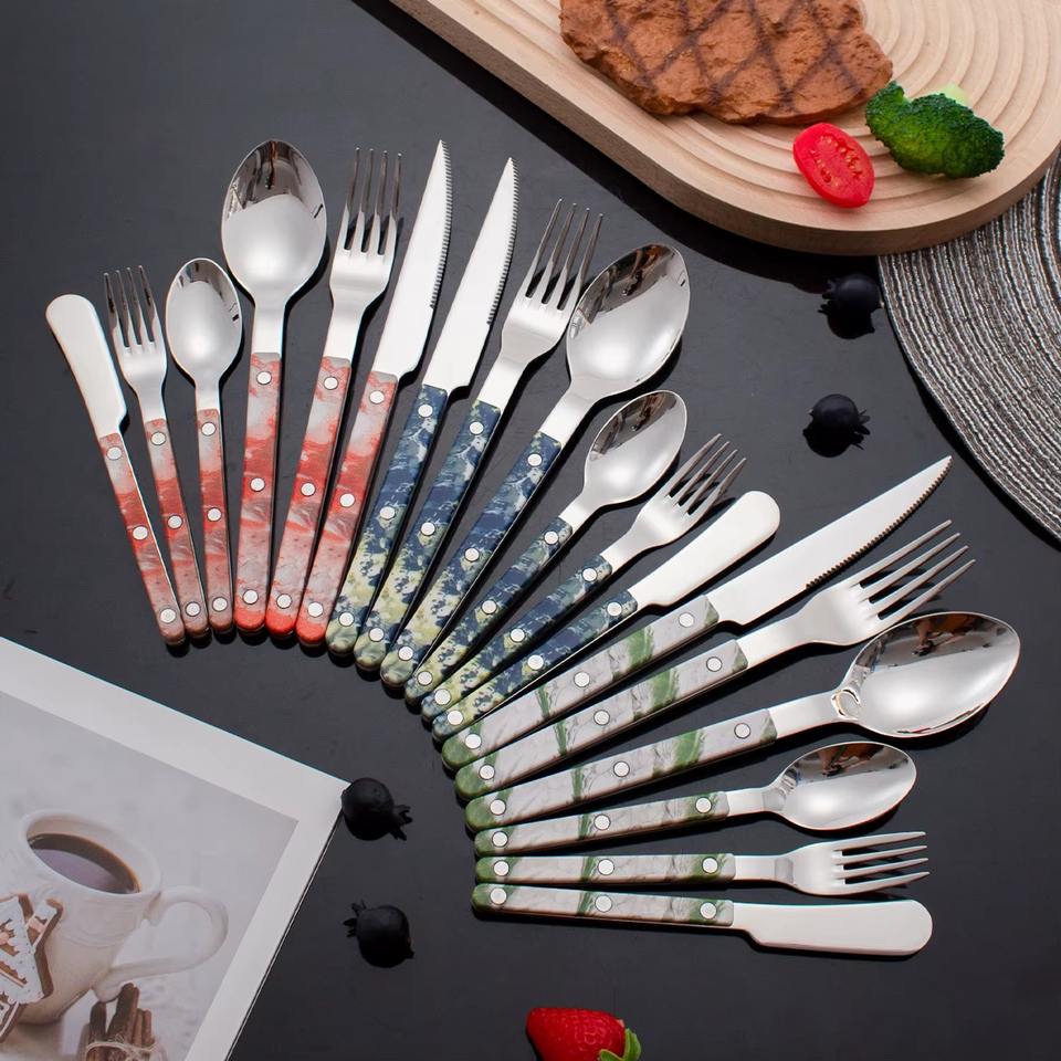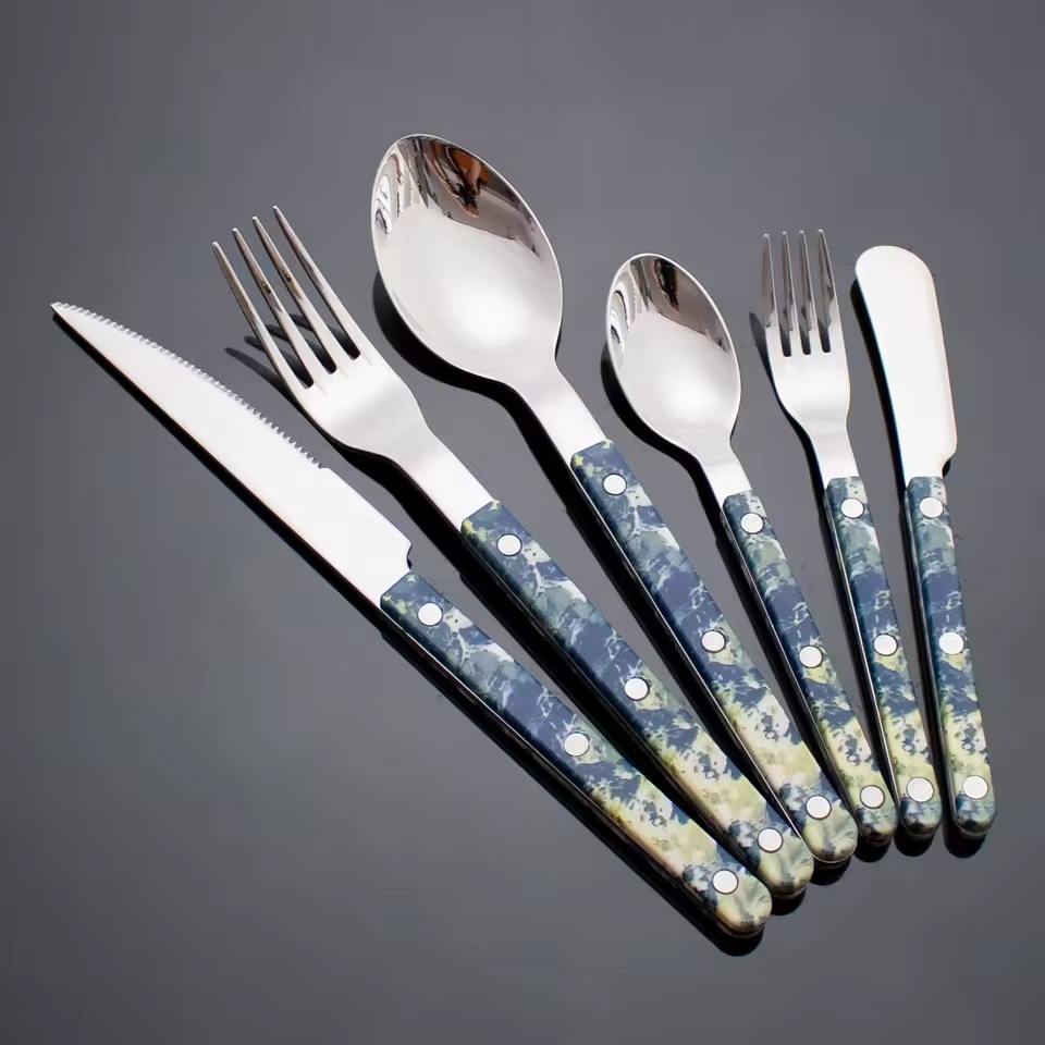 ชุดช้อนส้อมสแตนเลส ด้ามจับสีน้ำเงิน ทนทาน เหมาะสำหรับใช้ในสำนักงาน ห้องเก็บอาหาร อาหารครอบครัว รับรองแขก และเสิร์ฟบุฟเฟ่ต์
