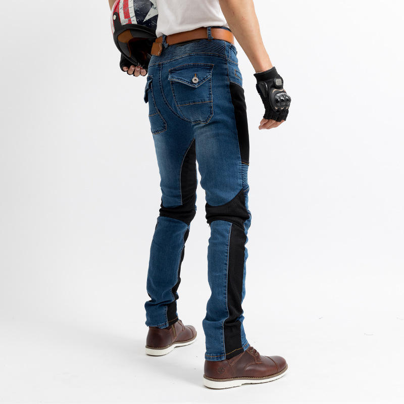 กางเกงยีนส์นักขี่จักรยานสำหรับผู้ชายแห้งเร็วระบายอากาศได้ดีทนทานพร้อมแผ่นรองที่ถอดออกได้แผงผ้าสีดำสำหรับป้องกันขณะขับขี่รถจักรยานยนต์