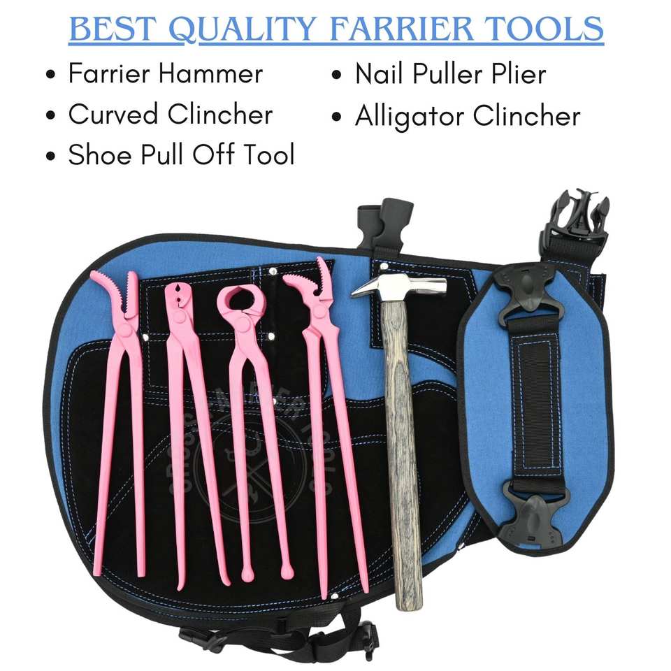 ชุดเครื่องมือช่างเกือกม้าแบบทนทาน พร้อมผ้ากันเปื้อน ค้อนตีสีดำ ที่ดึงตะปูสีชมพู ที่ดึงตะปูโค้ง และที่ดึงตะปูแบบฟันจระเข้
