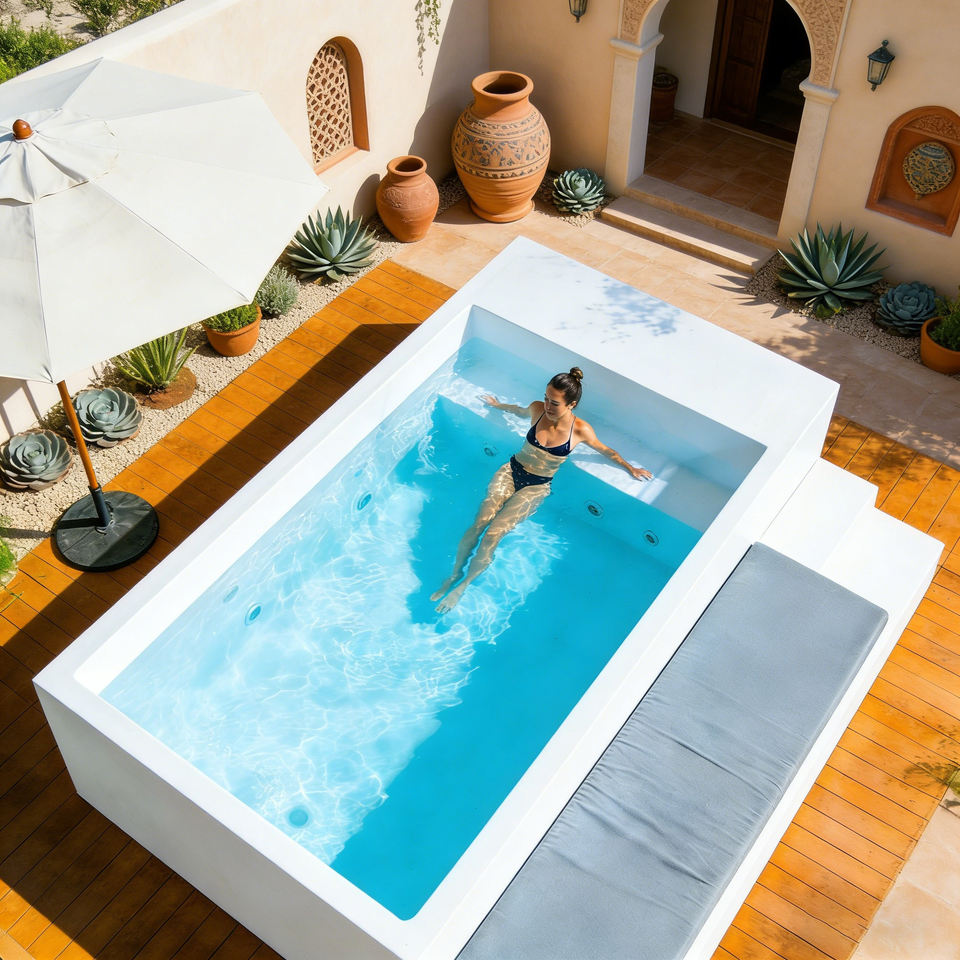 สระน้ำไฟเบอร์กลาสแบบตั้งพื้น ทนทาน พร้อมที่นั่งในตัว เหมาะสำหรับพื้นที่ขนาดเล็ก ใช้เป็นสระว่ายน้ำเหนือพื้นดินและอ่างน้ำร้อน