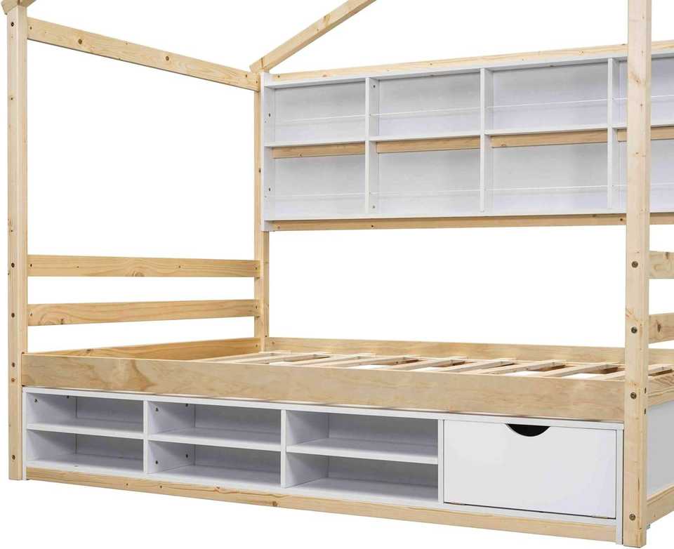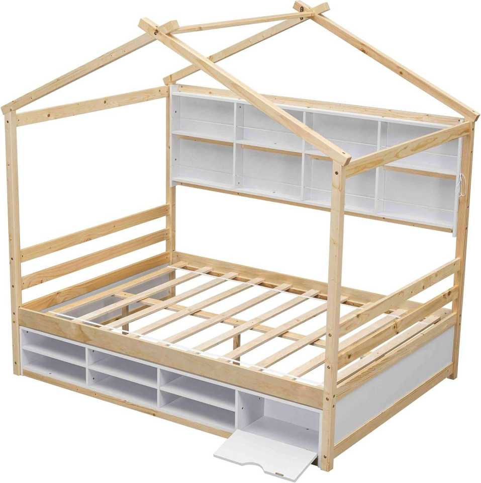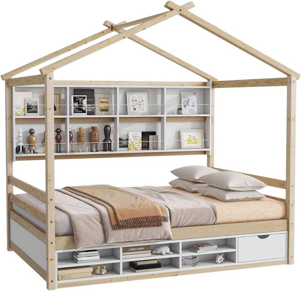 โครงเตียงสองชั้นไม้แบบดั้งเดิม ขนาดใหญ่ แข็งแรงทนทาน พร้อมชั้นวางของ 6 ชั้น ดีไซน์หลังคาในตัว เป็นมิตรกับสิ่งแวดล้อม ทำจากวัสดุธรรมชาติ เหมาะสำหรับห้องนอนและห้องนั่งเล่น