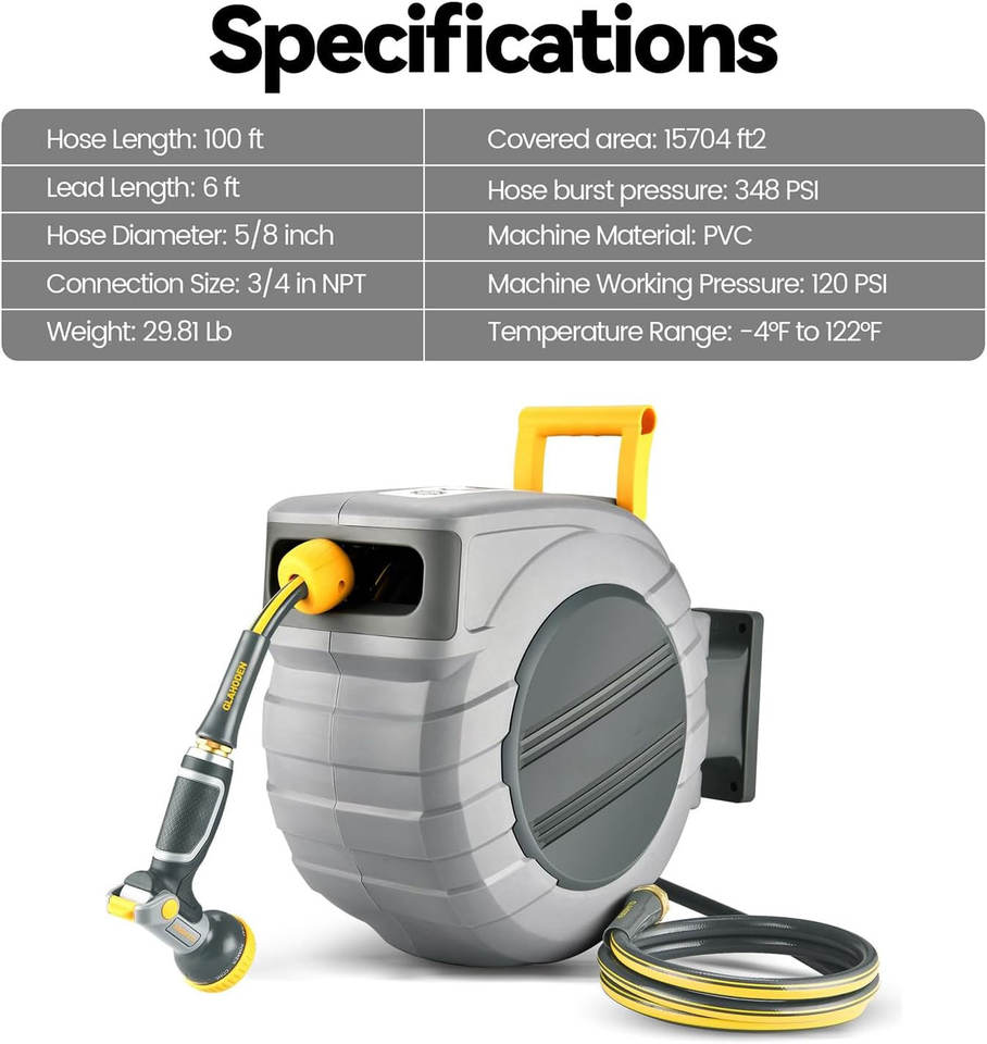 สายยางรดน้ำสวนแบบติดผนัง ยืดหดอัตโนมัติ ทนทาน ผลิตจากยาง มาตรฐาน CNS/ANSI ขนาดเส้นผ่านศูนย์กลาง 1/2 นิ้ว ป้องกันการกัดกร่อน ป้องกันรังสียูวี