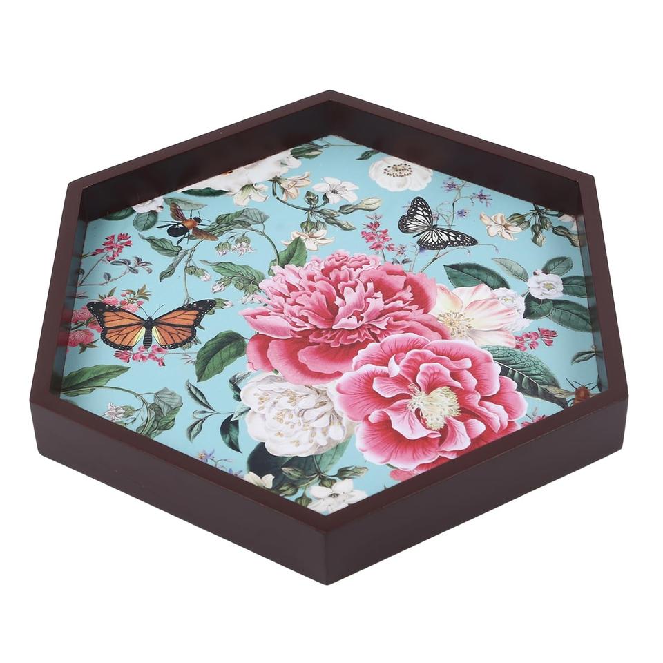 ถาดเสิร์ฟทรงหกเหลี่ยมทนทาน ถาดไม้ตกแต่งลายดอกไม้ผีเสื้อและดอกโบตั๋น สำหรับสั่งซื้อจำนวนมาก
