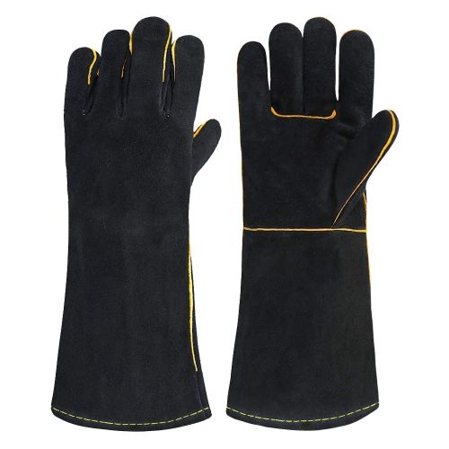 ถุงมือหนังวัวแท้ทนความร้อนสีดำเข้ม สำหรับงานอุตสาหกรรม ป้องกันการสั่นสะเทือน พร้อมปลอกข้อมือเพื่อความปลอดภัยสำหรับงานเชื่อม