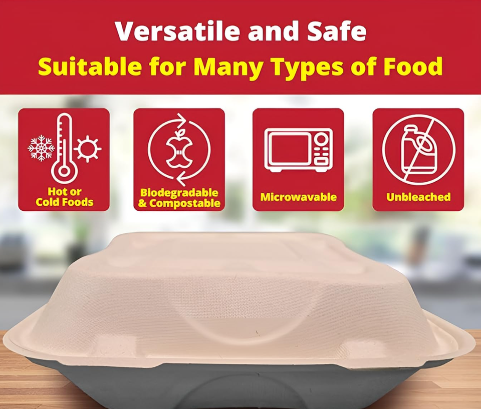 กล่องอาหารแบบฝาพับทำจากชานอ้อย ย่อยสลายได้ เป็นมิตรกับสิ่งแวดล้อม ป้องกันการรั่วซึม ทนทาน ใช้แล้วทิ้ง ใช้กับไมโครเวฟได้