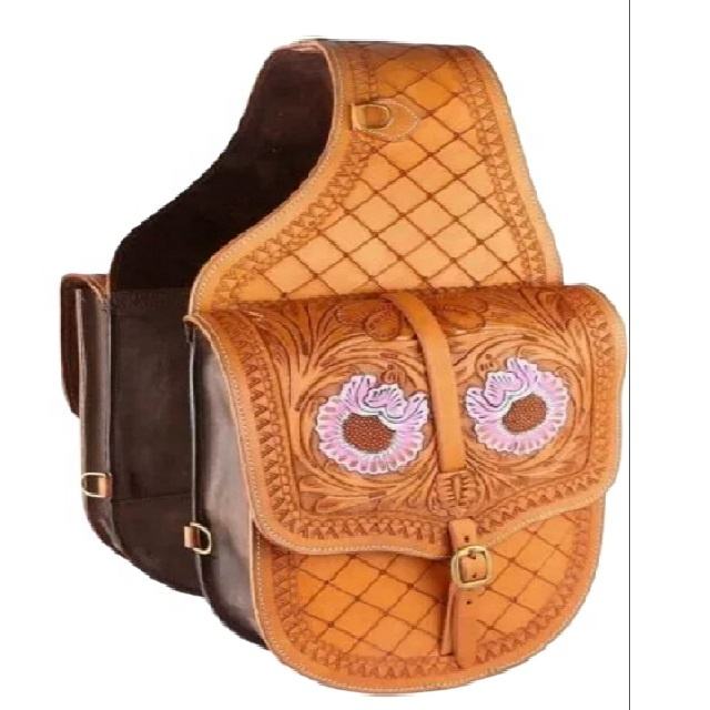 Durable Lightweight Thick Grain Leather Western Equestrian Saddle Bag Silver Conchos Floral Tooled Multifunctional Breathable