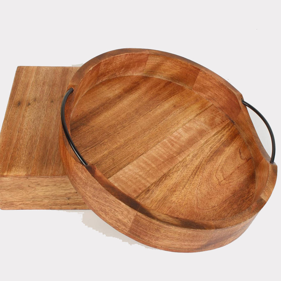 ถาดไม้มะม่วงทนทานพร้อมที่จับเหล็กทำเสร็จคุณภาพสูงสำหรับบ้านไร่กลางใช้ในครัวหรือตั้งโชว์โต๊ะกาแฟ