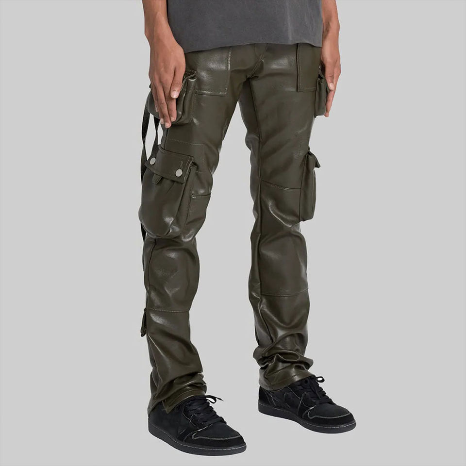 กางเกงคาร์โก้หนังผู้ชาย ทนทาน ทรงคลาสสิก เหมาะสำหรับใส่ลำลองและสตรีทแวร์ กางเกงคาร์โก้หนังผู้ชายทันสมัยสำหรับขายออนไลน์