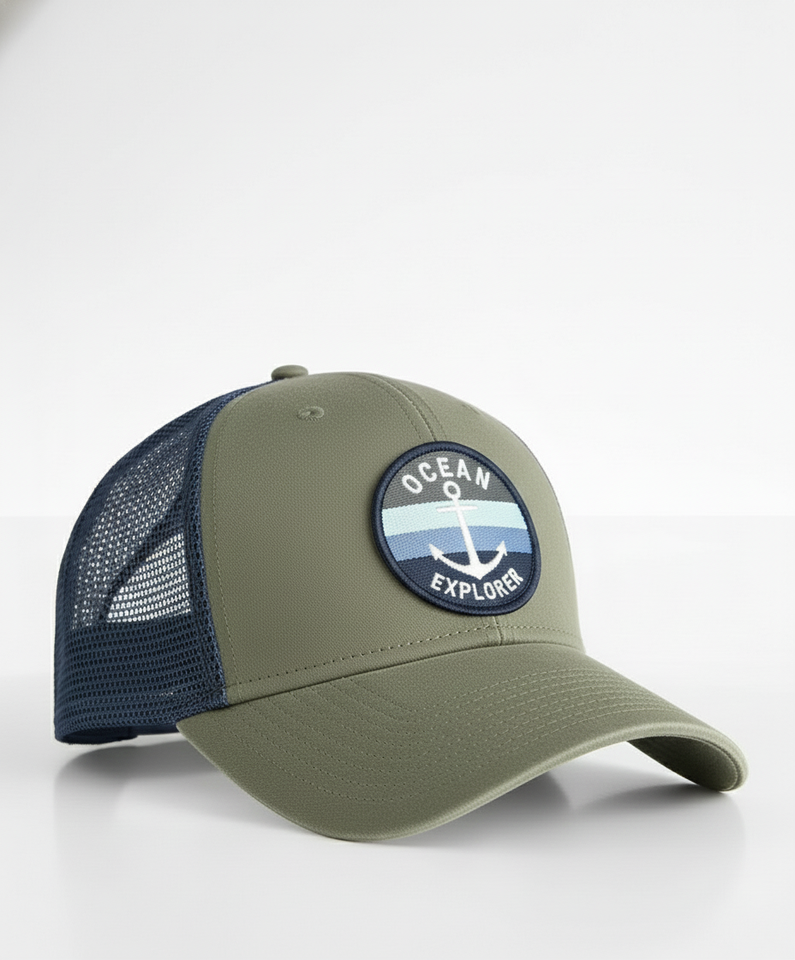 หมวกเบสบอลสีเขียวมะกอกสำหรับผู้ชายที่ทนทาน | แพทช์ธีมแองเคอร์ โอเชียน เอ็กซ์พลอเรอร์ | หมวกตาข่ายปรับได้