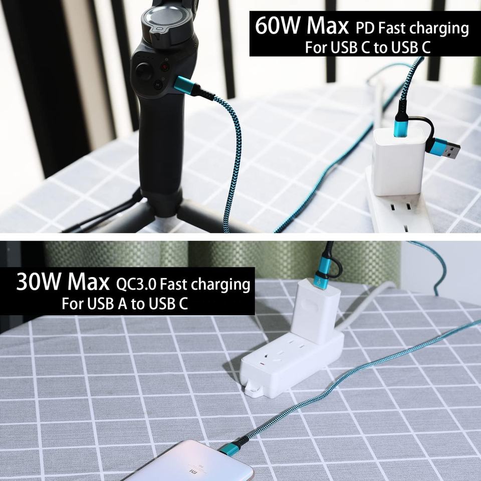 Durable Nylon Braided 2-in-1 Fast Charging Cable 60W PD QC Type C Cable Fast Charging with Data Sync for Android Phones Laptops