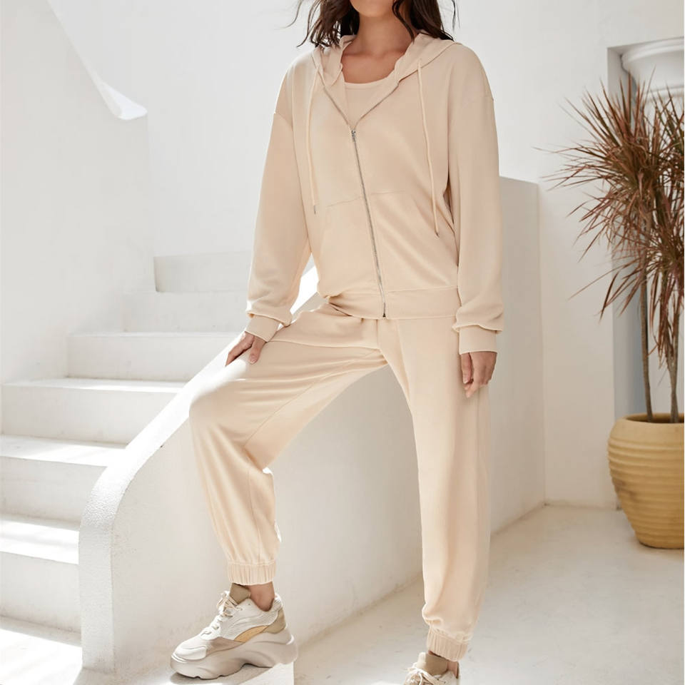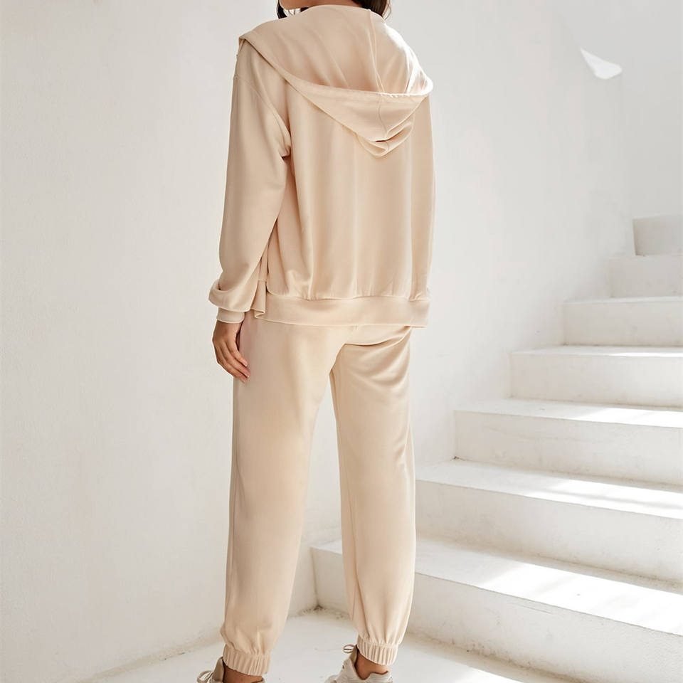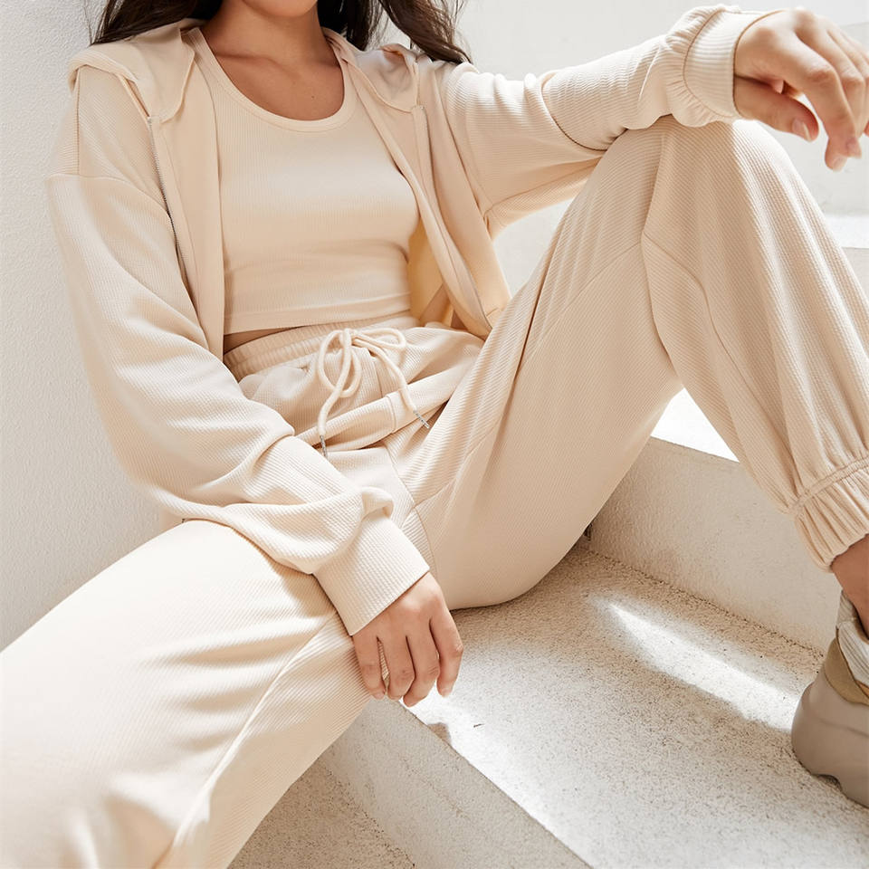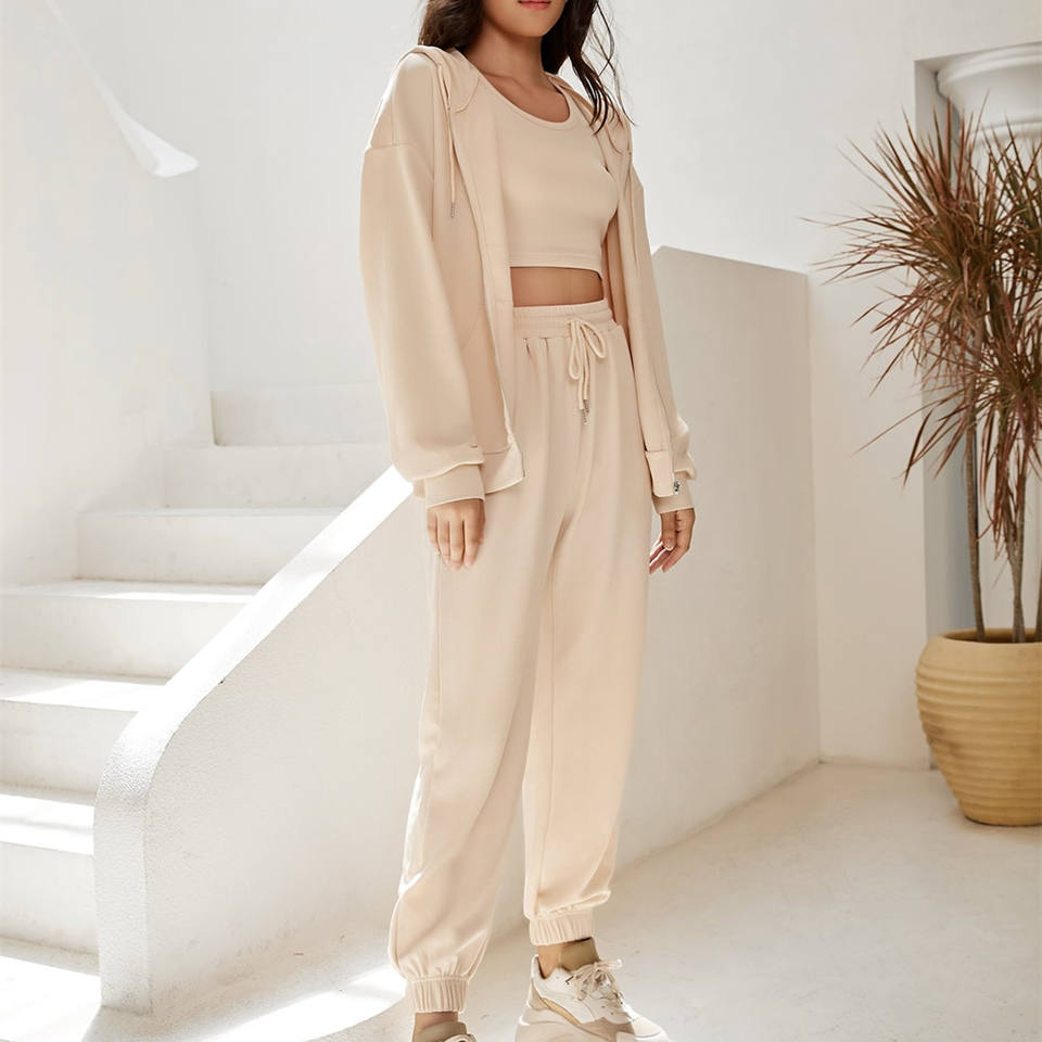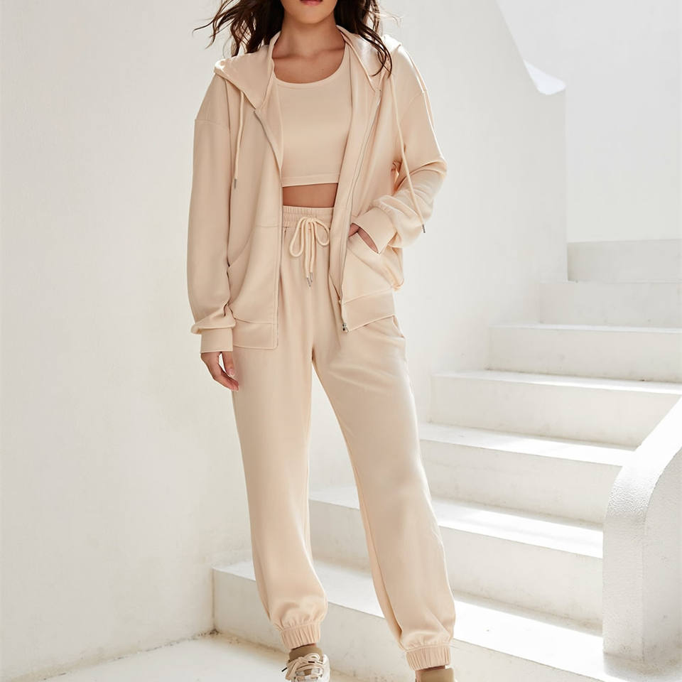 กางเกงวอร์มขายาวโอเวอร์ไซส์สีทึบชุด2ชิ้นผ้าคอตตอนเนื้อนุ่มมีฮู้ดขาดซิปตกแต่งเป็นมิตรต่อสิ่งแวดล้อม