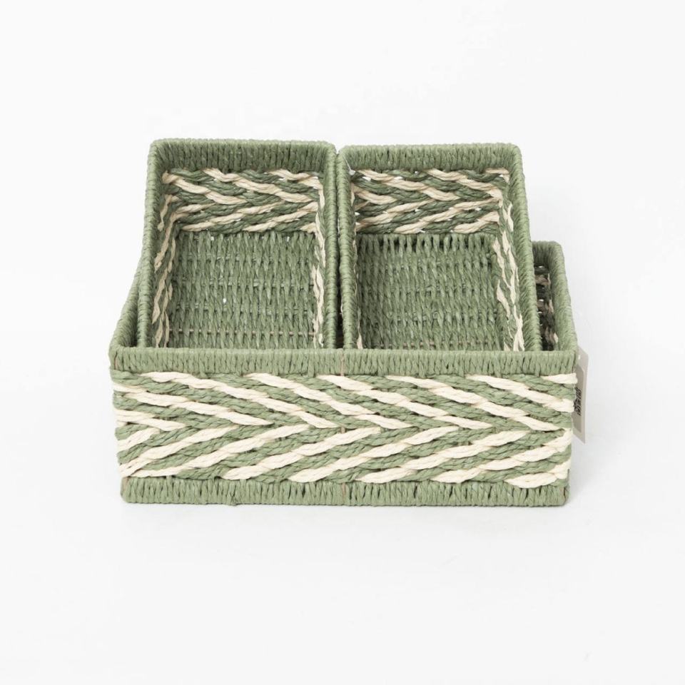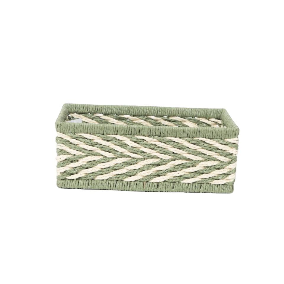 ตะกร้าเก็บของทรงสี่เหลี่ยมทำจากกระดาษแข็งแรงทนทาน สีเขียว สำหรับจัดระเบียบชั้นวางของ ตะกร้าสานตกแต่งบ้านอย่างยั่งยืน ผลิตในเวียดนาม