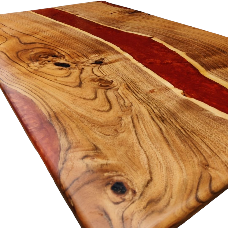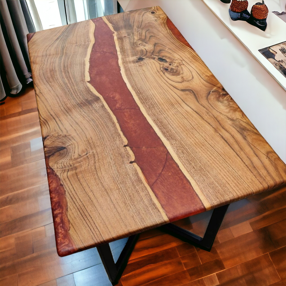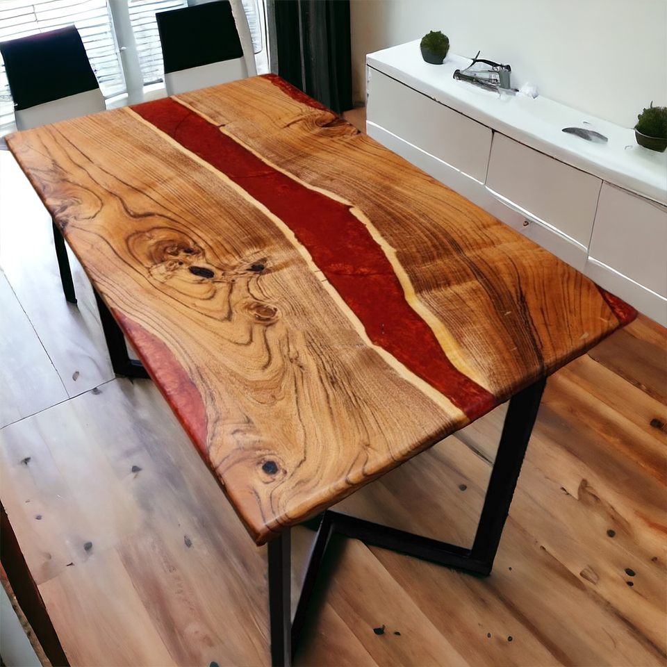 โต๊ะแม่น้ำเรซินอีพ็อกซี่มุกสีแดงทนทานทำจากไม้อะคาเซียแข็งและขาโลหะทนทานเฟอร์นิเจอร์รับประทานอาหารที่ทันสมัยหรูหราปรับแต่งได้
