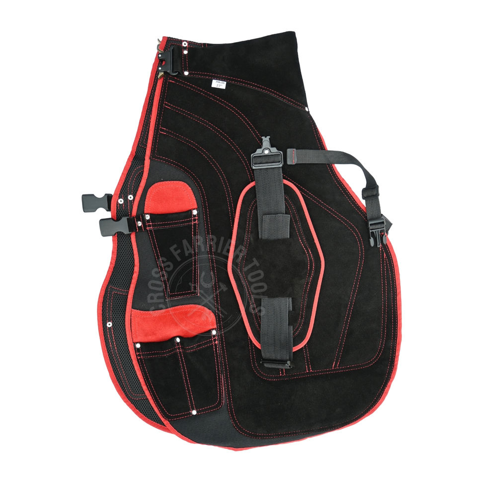 ผ้ากันเปื้อนช่างเกือกม้าสีแดงและสีดำ ทนทาน พร้อมช่องเก็บมีด เข็มขัดปรับได้ หัวเข็มขัดสแตนเลส ผ้าตาข่ายแบบยาว