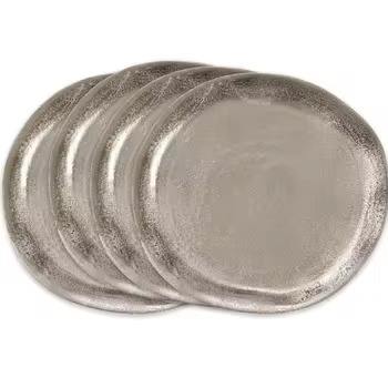 แผ่นที่ชาร์จโลหะสีเงินทนทานเครื่องใช้บนโต๊ะอาหารที่ออกแบบอย่างหรูหราสำหรับงานเลี้ยงอาหารค่ำในบ้านงานแต่งงานและการตกแต่งงาน