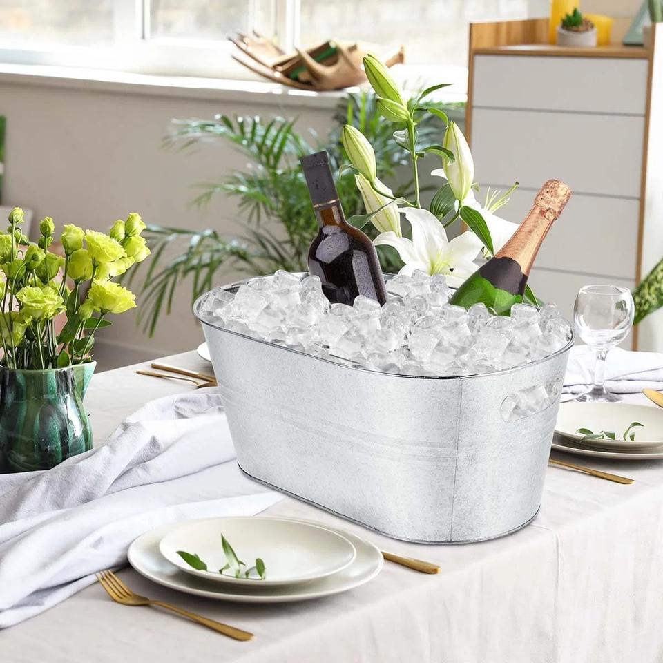 กล่องเก็บความเย็นสแตนเลสสีเงินคุณภาพสูงสำหรับงานปาร์ตี้ เก็บไวน์และเบียร์ได้ ใช้เป็นสถานีเครื่องดื่มบนโต๊ะได้อเนกประสงค์