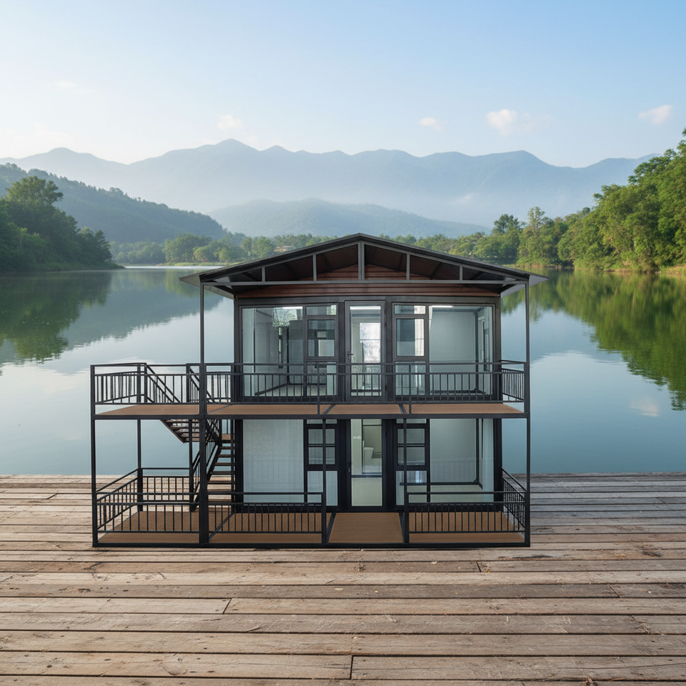 บ้านคอนเทนเนอร์เหล็กสองชั้น ทนทาน พร้อมบันไดพับได้ ระเบียง ขนาด 40 ฟุต 2 ชั้น สำหรับอยู่อาศัยในเมืองและสำนักงาน