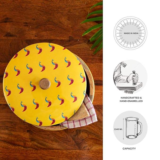 กล่องชาปาตีไม้ทนทานพร้อมลายพิมพ์นกยูง ฝาปิดสำหรับครัว หม้ออบเคลือบมือ