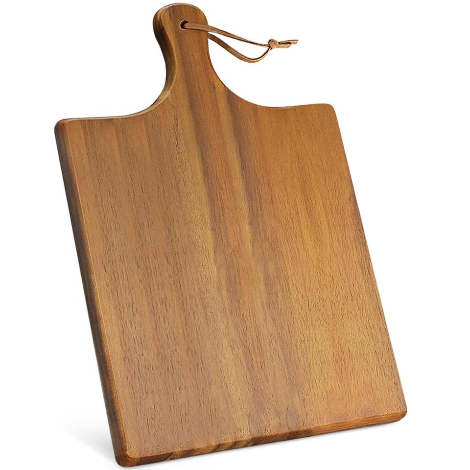 เขียงไม้อะคาเซียทนทานและเชื่อถือได้มีรูแขวนทรงสี่เหลี่ยมพร้อมที่จับเครื่องครัวเป็นมิตรต่อสิ่งแวดล้อม