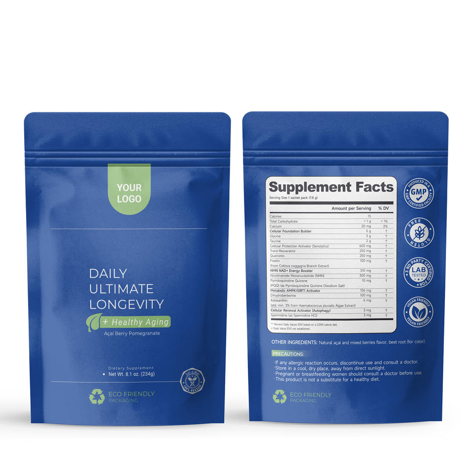 ดูร์เลเวล อัลติเมท ลองจูทีฟ อาหารเสริมผู้ใหญ่ชนิดผง ทรานส์-เรสเวอราทรอล เควอซิติน เอ็นเอดี+ อาหารเพื่อสุขภาพ ช่วยเพิ่มพลังงาน เกรดอาหาร สำหรับผู้ผลิต (OEM) และแบรนด์ส่วนตัว