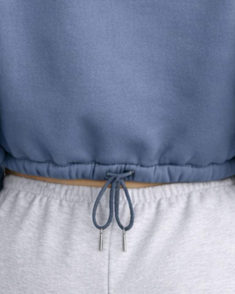 เสื้อฮู้ดครอปสีน้ำเงินหม่น ผ้าฟลีซ ซิป ¼ กระเป๋าคางูโร ชายเสื้อปรับได้ด้วยเชือกผูก สไตล์ลำลอง สตรีทแวร์ ให้ความอบอุ่น เหมาะสำหรับผู้หญิง