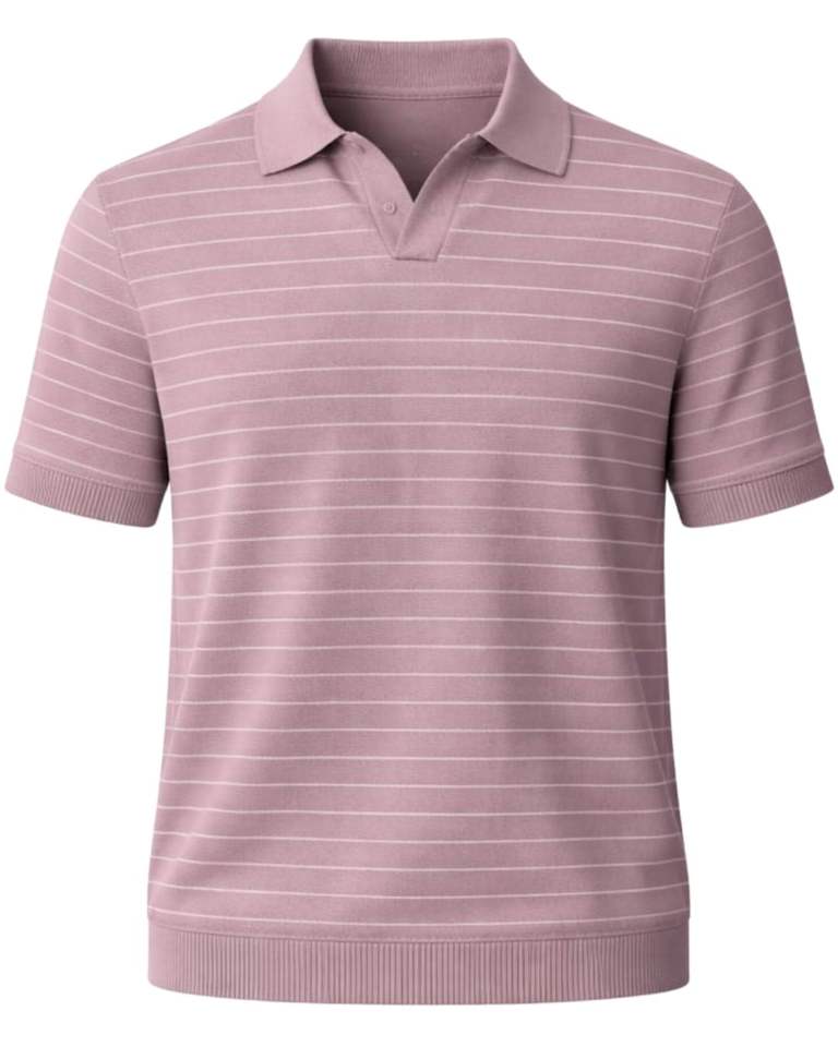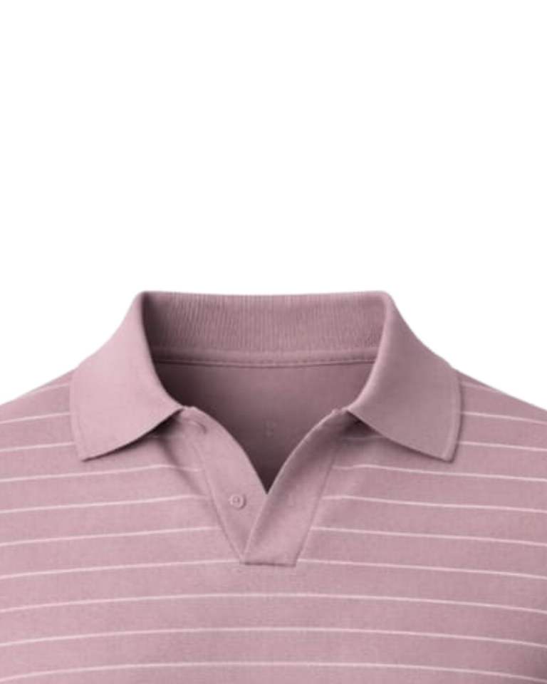 เสื้อโปโลผู้ชายสีชมพูอมเทา ลายทาง แขนสั้น ผ้าถัก ขอบริบ ทรงเข้ารูป สวมใส่สบาย ผลิตจากผ้าฝ้ายผสม รับผลิตตามแบบ OEM