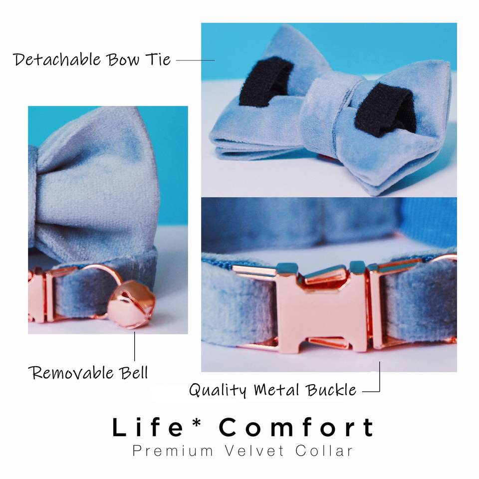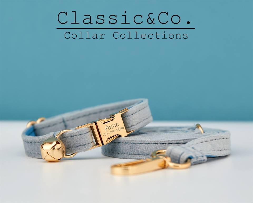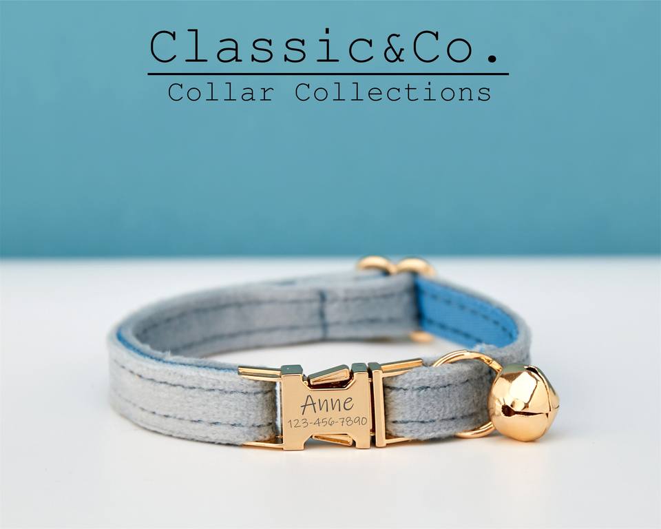 ชุดปลอกคอและสายจูงแมวและสุนัขพันธุ์เล็ก Dustyblue Veet แบบปรับแต่งได้ พร้อมป้ายชื่อสลักฟรี กระดิ่งทอง - ของขวัญวันเกิดสำหรับสัตว์เลี้ยง