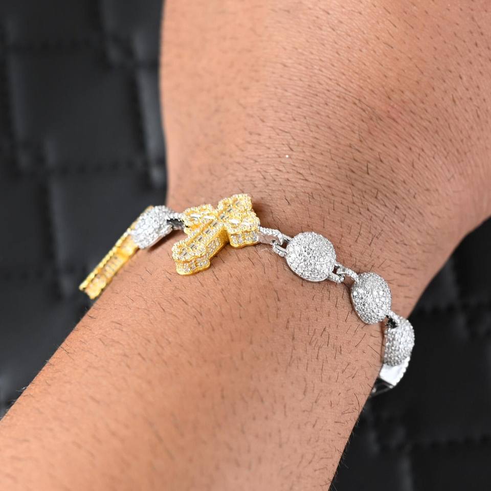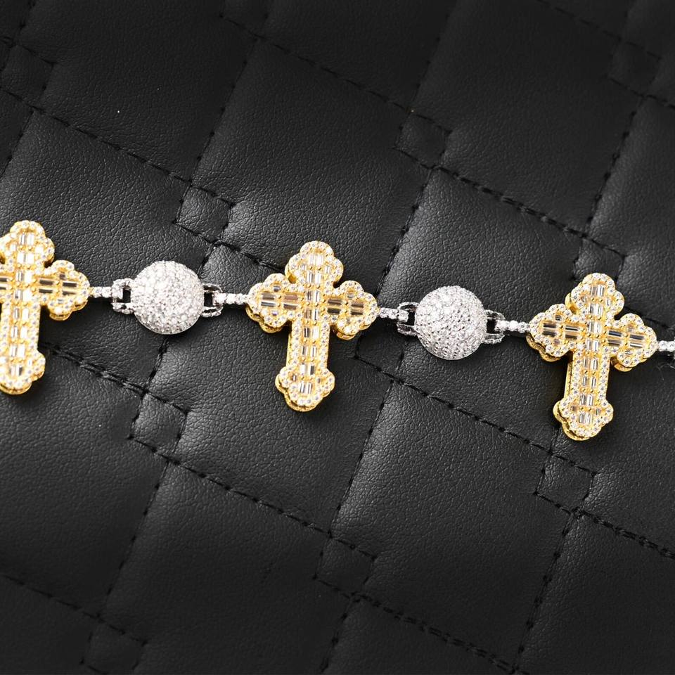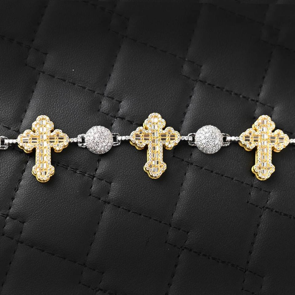 Dvars Diamond Two Tone Cross Gold Plated Brilliant Cut Moissanite VVS D Color Solid 925 Sterling Silver Claw Setting Bracelet