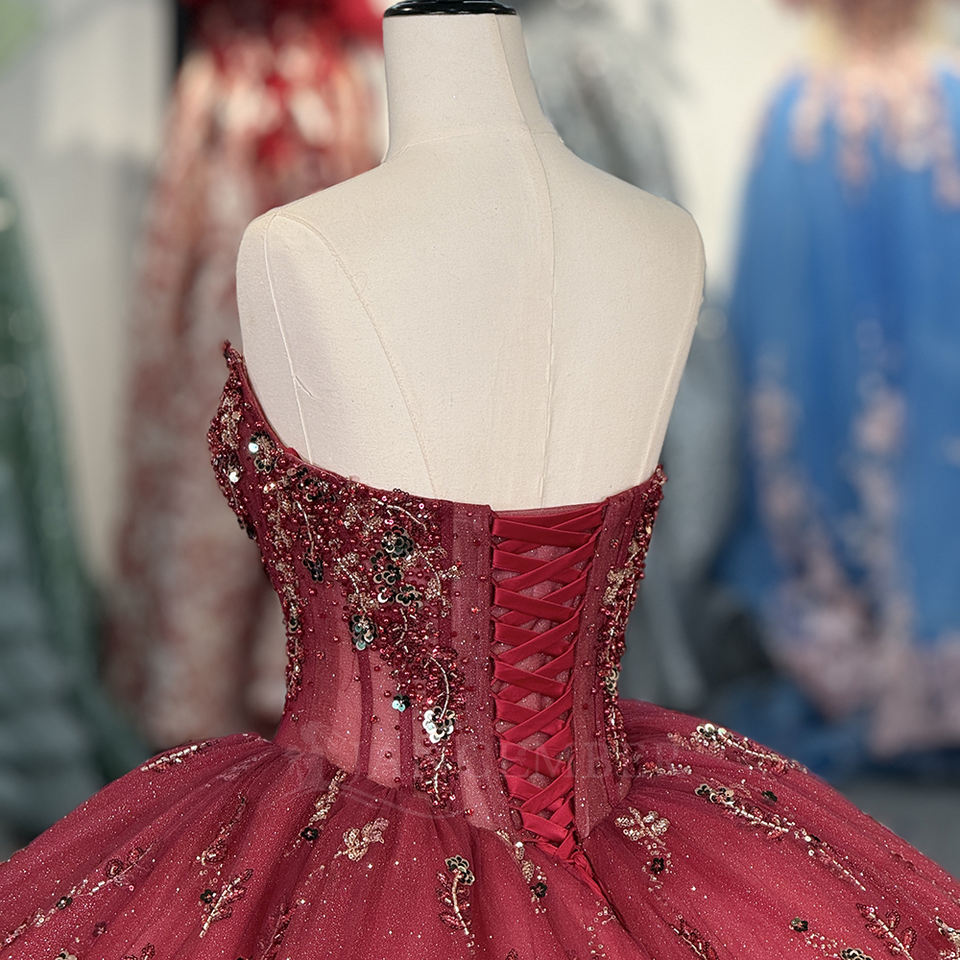 ชุดราตรีงาน Quinceanera, Sweet 16, งานเลี้ยงฉลองวันเกิด, งาน Bat Mitzvah, งานประกวด รุ่น DY6925 สีชมพูหวาน แบบเกาะอก ประดับด้วยลายดอกไม้ระยิบระยับ ผ้าชีฟอง