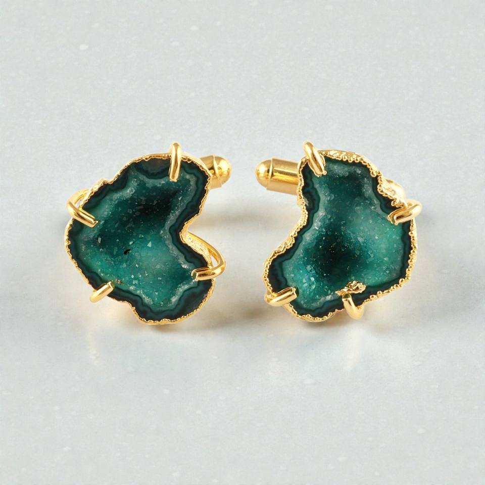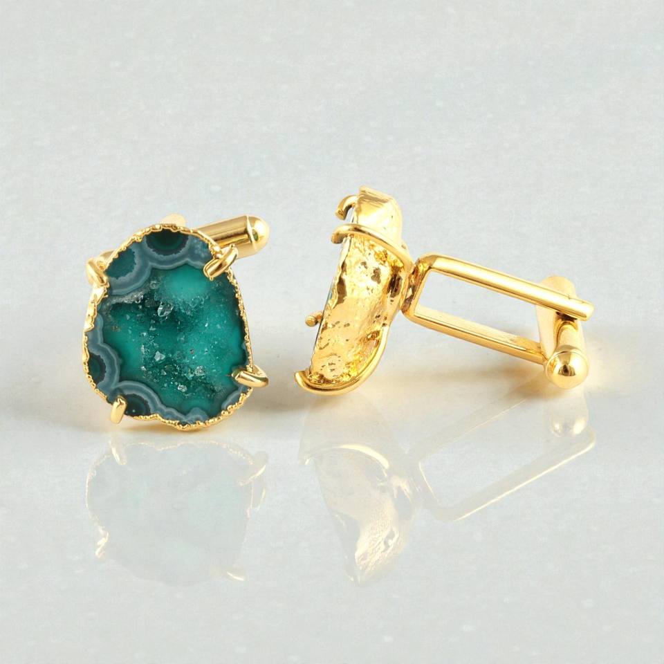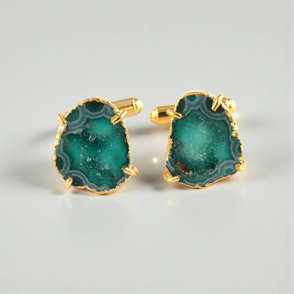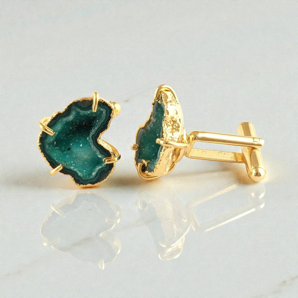 กระดุมข้อมือหินอาเกตสีเขียวเคลือบทองทำมือสำหรับผู้ชาย เครื่องประดับทำมือ