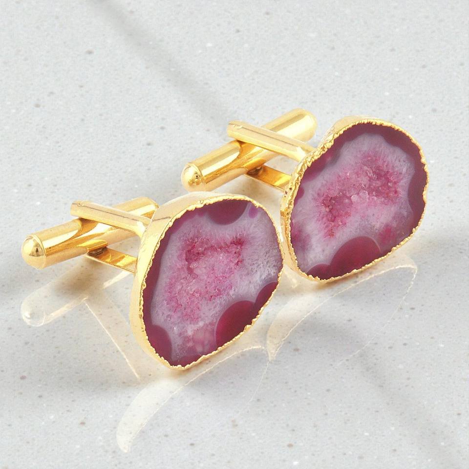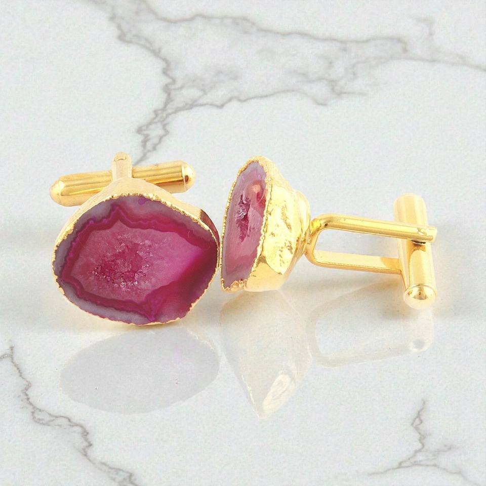 กระดุมข้อมือหินอาเกตสีชมพูเคลือบทอง สำหรับเครื่องประดับผู้ชายทำมือ
