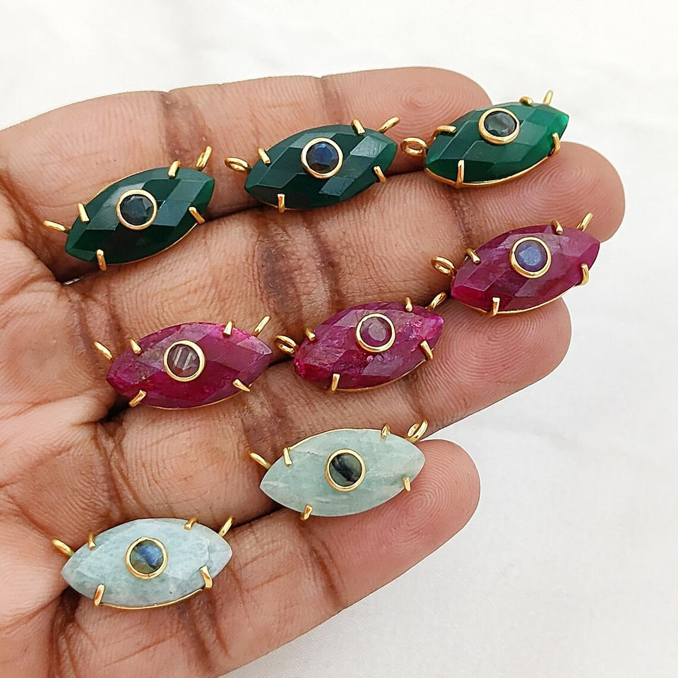 ชุดง่ามลายเพชรย้อมสีไพลิน19x9มม. จี้รูปดวงตาชุบทองจี้เงินแท้ทำด้วยมือเครื่องประดับป้องกันจี้หินคู่