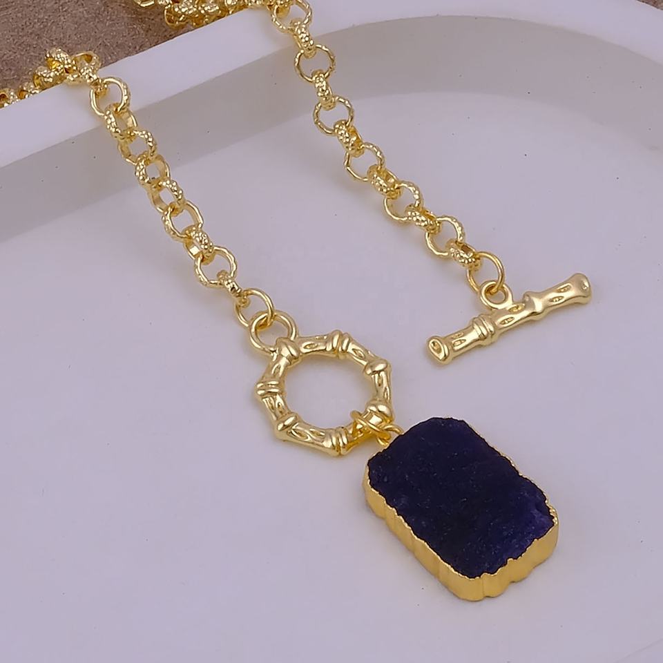 สร้อยคอแบบ Toggle ประดับพลอยแซฟไฟร์ดิบสีน้ำเงินเข้ม ประจำเดือนกันยายน ชุบทองบนทองเหลือง ประดับคริสตัลดิบทำมือ หินบำบัด ดีไซน์ทันสมัย