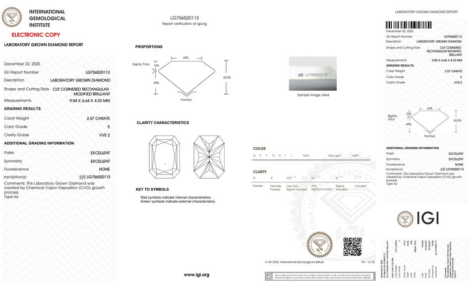 E Color VVS2 Clarity 2.57 Carat Radiant Cut CVD Lab Grown Diamond IGI Certified For Custom Engagement Ring