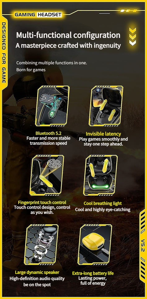 E-Sports สำหรับชุดหูฟังบลูทูธเล่นเกม TWS ไร้สายในหูพร้อมชิปเซ็ต JL เวลาแฝงต่ำไฟ LED แสดงโหมดดิจิตอลที่มีสีสัน