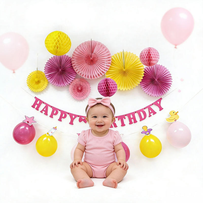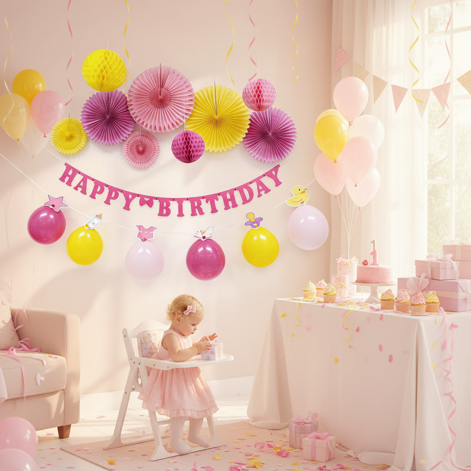 ชุดตกแต่งงานวันเกิดเด็กผู้หญิง EAST TERN 11 ชิ้น ชุดลูกโป่ง พวงมาลัย กระดาษพับพัด ลูกบอลรังผึ้ง ราคาโรงงาน ทนทาน