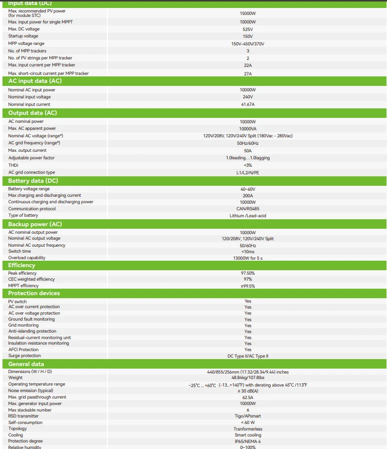 อินเวอร์เตอร์ไฮบริด Gr0 วัตต์ 10 กิโลวัตต์ | อินเวอร์เตอร์แบบแยกเฟส SPH 10000TL-HU-US 120V/240V