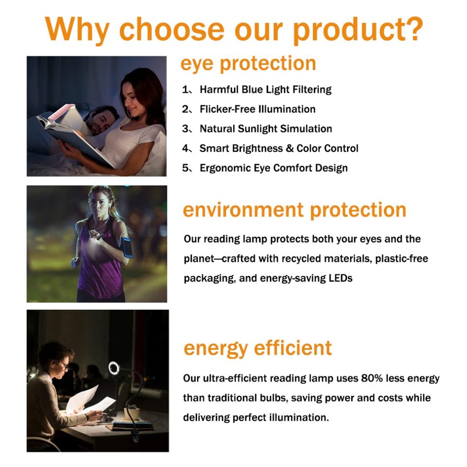 โคมไฟอ่านหนังสือแบบพกพา EGH แบบพับได้ ใช้พอร์ต USB แบตเตอรี่ลิเธียม ดีไซน์หนีบได้ ปรับงอได้ สีดำขาว ไฟ LED สำหรับอ่านหนังสือ สำหรับสหราชอาณาจักร