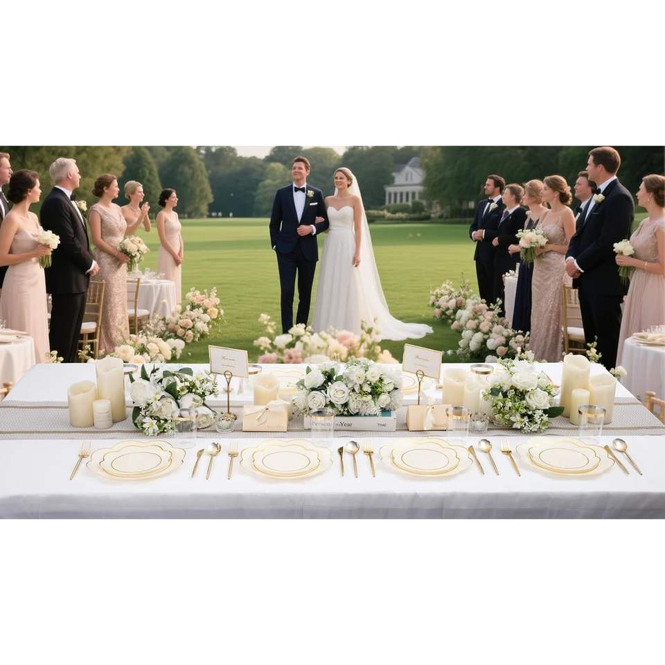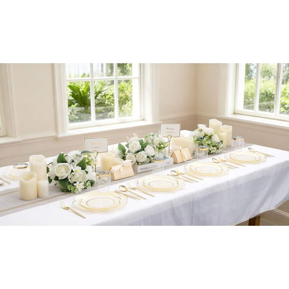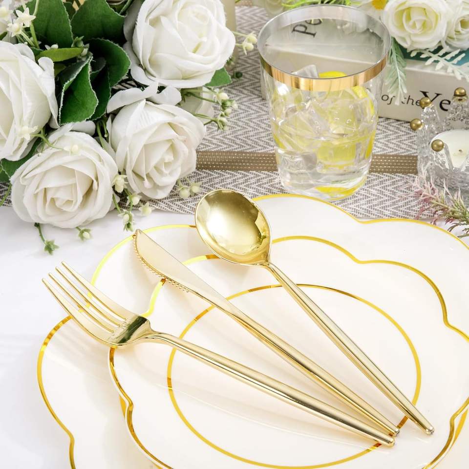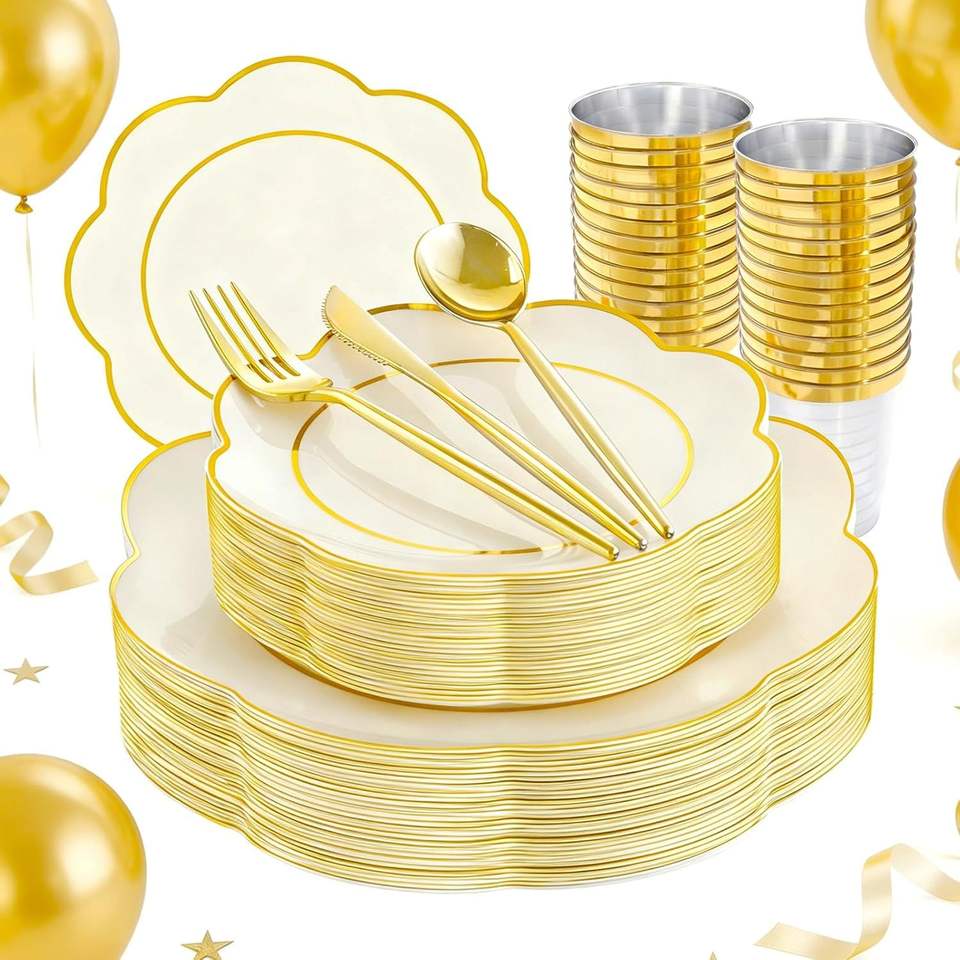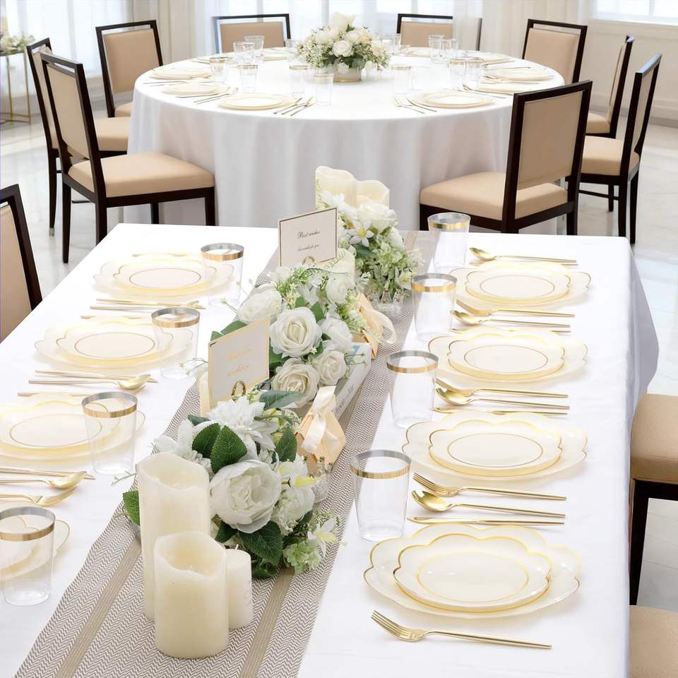 EI 180pcs Beige Plastic Dinnerware Set Heavy-Duty Disposable Party Plates with Gold & Silverware 30 White Dinnerware Kits